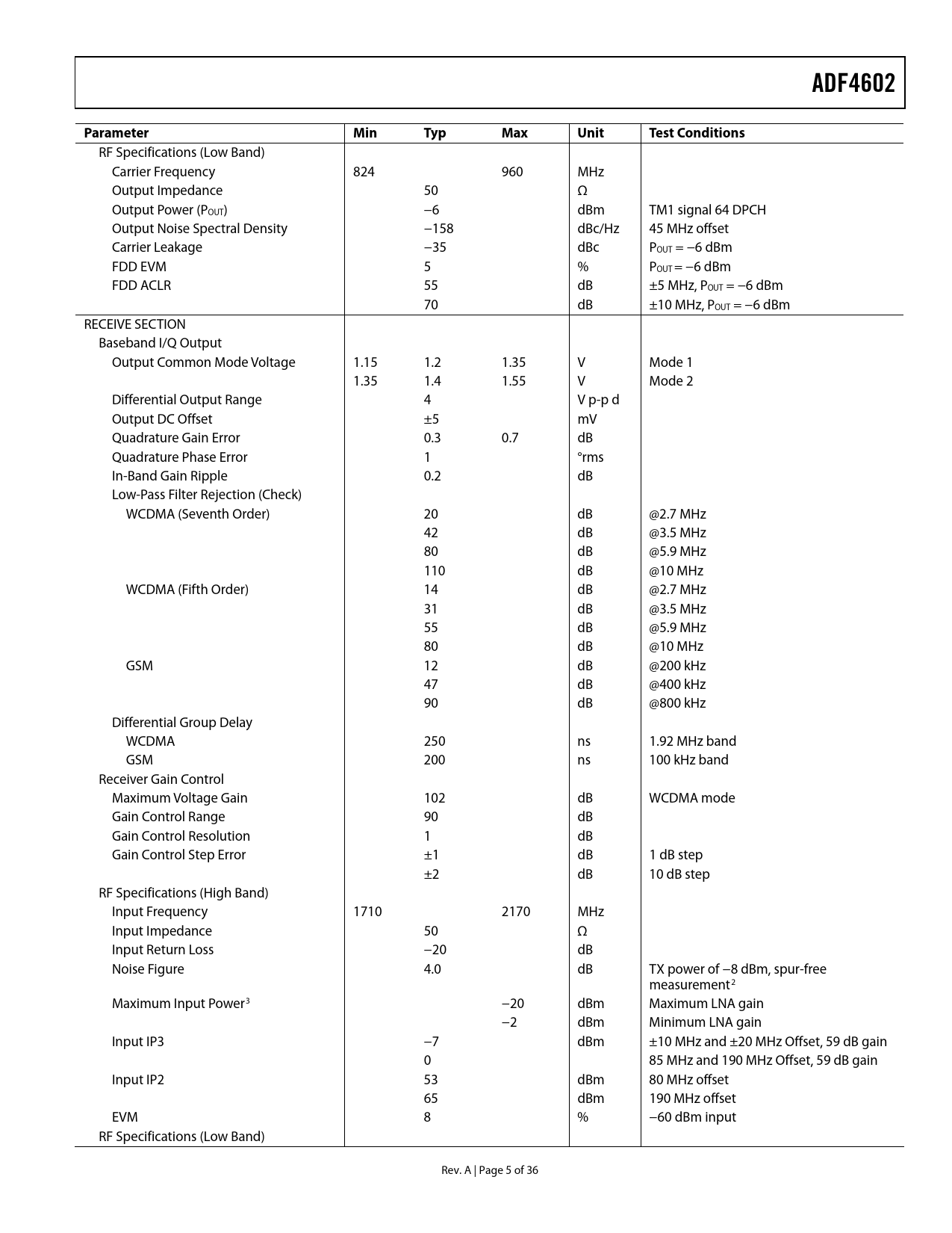link to page 7 link to page 7 ADF4602ParameterMinTypMaxUnitTest Conditions RF Specifications (Low Band) Carrier Frequency 824 960 MHz Output Impedance 50 Ω Output Power (POUT) −6 dBm TM1 signal 64 DPCH Output Noise Spectral Density −158 dBc/Hz 45 MHz offset Carrier Leakage −35 dBc POUT = −6 dBm FDD EVM 5 % POUT = −6 dBm FDD ACLR 55 dB ±5 MHz, POUT = −6 dBm 70 dB ±10 MHz, POUT = −6 dBm RECEIVE SECTION Baseband I/Q Output Output Common Mode Voltage 1.15 1.2 1.35 V Mode 1 1.35 1.4 1.55 V Mode 2 Differential Output Range 4 V p-p d Output DC Offset ±5 mV Quadrature Gain Error 0.3 0.7 dB Quadrature Phase Error 1 °rms In-Band Gain Ripple 0.2 dB Low-Pass Filter Rejection (Check) WCDMA (Seventh Order) 20 dB @2.7 MHz 42 dB @3.5 MHz 80 dB @5.9 MHz 110 dB @10 MHz WCDMA (Fifth Order) 14 dB @2.7 MHz 31 dB @3.5 MHz 55 dB @5.9 MHz 80 dB @10 MHz GSM 12 dB @200 kHz 47 dB @400 kHz 90 dB @800 kHz Differential Group Delay WCDMA 250 ns 1.92 MHz band GSM 200 ns 100 kHz band Receiver Gain Control Maximum Voltage Gain 102 dB WCDMA mode Gain Control Range 90 dB Gain Control Resolution 1 dB Gain Control Step Error ±1 dB 1 dB step ±2 dB 10 dB step RF Specifications (High Band) Input Frequency 1710 2170 MHz Input Impedance 50 Ω Input Return Loss −20 dB Noise Figure 4.0 dB TX power of −8 dBm, spur-free measurement2 Maximum Input Power3 −20 dBm Maximum LNA gain −2 dBm Minimum LNA gain Input IP3 −7 dBm ±10 MHz and ±20 MHz Offset, 59 dB gain 0 85 MHz and 190 MHz Offset, 59 dB gain Input IP2 53 dBm 80 MHz offset 65 dBm 190 MHz offset EVM 8 % −60 dBm input RF Specifications (Low Band) Rev. A | Page 5 of 36 Document Outline FEATURES APPLICATIONS FUNCTIONAL BLOCK DIAGRAM TABLE OF CONTENTS REVISION HISTORY GENERAL DESCRIPTION SPECIFICATIONS TIMING CHARACTERISTICS ABSOLUTE MAXIMUM RATINGS ESD CAUTION PIN CONFIGURATION AND FUNCTION DESCRIPTIONS TYPICAL PERFORMANCE CHARACTERISTICS THEORY OF OPERATION TRANSMITTER DESCRIPTION I/Q Baseband I/Q Modulator VCO Output TX Output Baluns DACS GENERAL PURPOSE OUTPUTS RECEIVER DESCRIPTION LNAs Mixers Baseband Section Gain Control DC Offset Compensation POWER MANAGEMENT FREQUENCY SYNTHESIS Reference Path SERIAL PORT INTERFACE (SPI) Format OPERATION AND TIMING Read REGISTERS REGISTER MAP REGISTER DESCRIPTION SOFTWARE INITIALIZATION PROCEDURE INITIALIZATION SEQUENCE Nonvolatile Memory (NVM) Initialization Programming Transmit and Receive frequencies APPLICATIONS INFORMATION INTERFACING THE ADF4602 TO THE AD9963 AD9963 ADC Inputs Interfacing to the AD9963 Rx Baseband Inputs AD9963 DAC Outputs Reference Voltage Current Scaling Resistor, RSET Gain Scaling Parameters RECEIVE SENSITIVITY Interfacing to the AD9963 TX Baseband Outputs OUTLINE DIMENSIONS ORDERING GUIDE