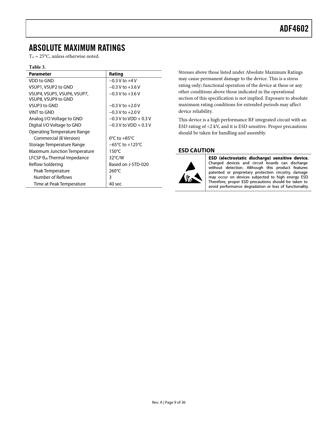 ADF4602. ABSOLUTE MAXIMUM RATINGS. Table 3. Parameter Rating. ESD CAUTION