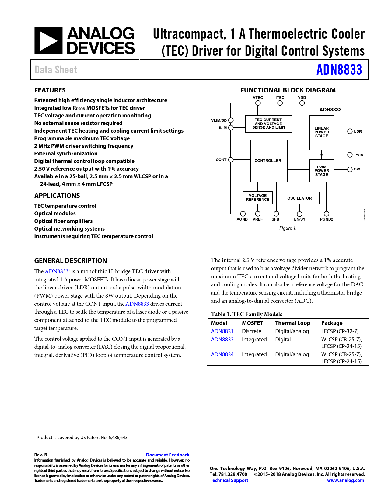 target temperature. ADN8831 Discrete Digital/analog LFCSP (CP-32-7) The control voltage applied to the CONT input is generated by a ADN8833 Integrated Digital WLCSP (CB-25-7), digital-to-analog converter (DAC) closing the digital proportional, LFCSP (CP-24-15) integral, derivative (PID) loop of temperature control system. ADN8834 Integrated Digital/analog WLCSP (CB-25-7), LFCSP (CP-24-15) 1 Product is covered by US Patent No. 6,486,643.