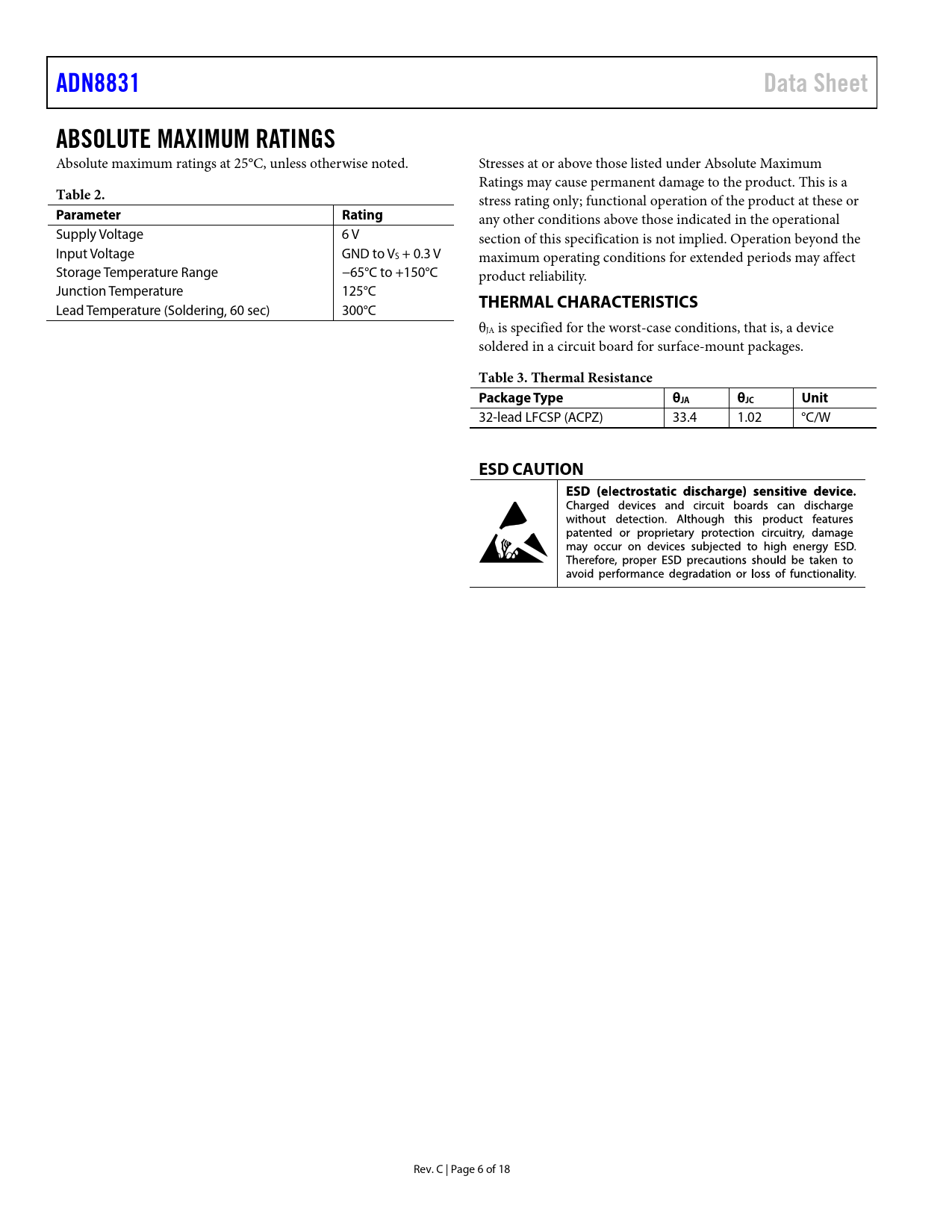 ADN8831 Data Sheet ABSOLUTE MAXIMUM RATINGS Table 2 Parameter Rating THERMAL CHARACTERISTICS