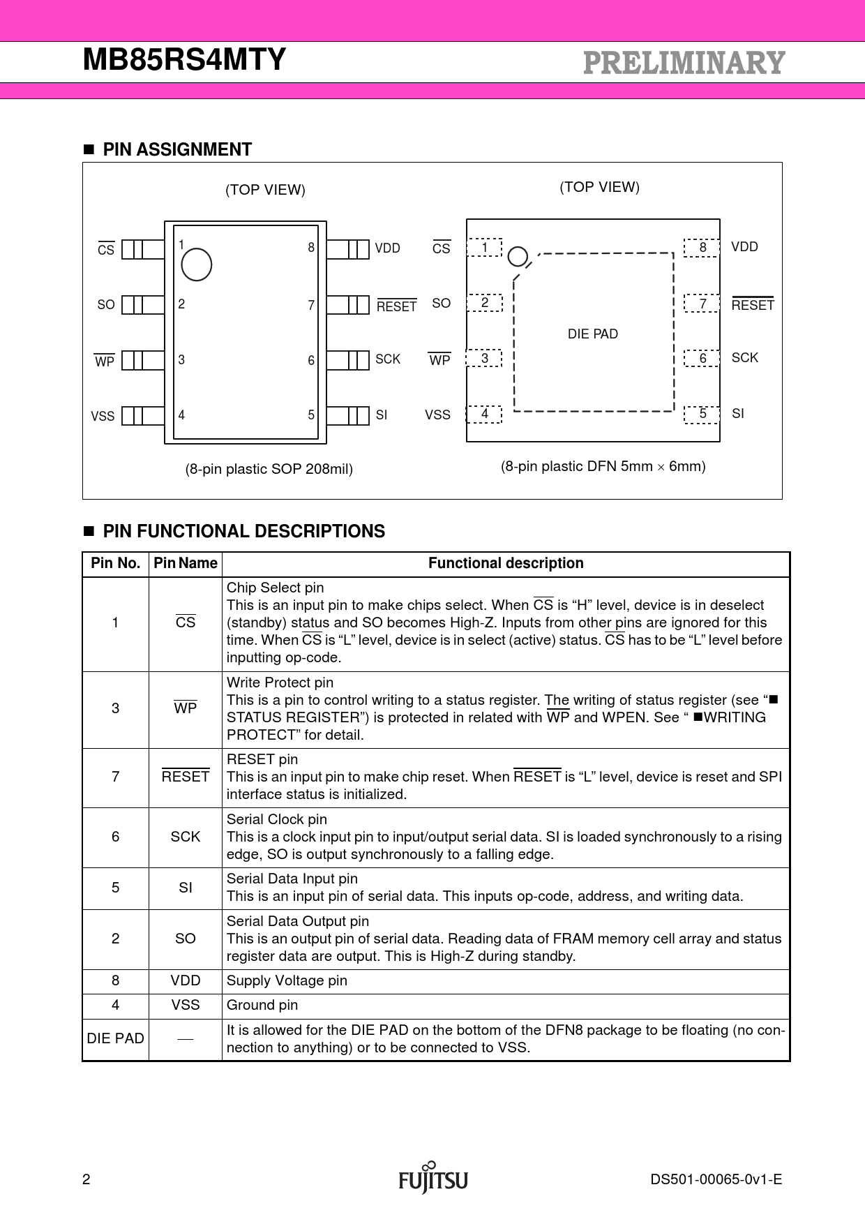 MB85RS4MTY. PIN ASSIGNMENT. PIN FUNCTIONAL DESCRIPTIONS. Pin No. Pin Name. Functional description