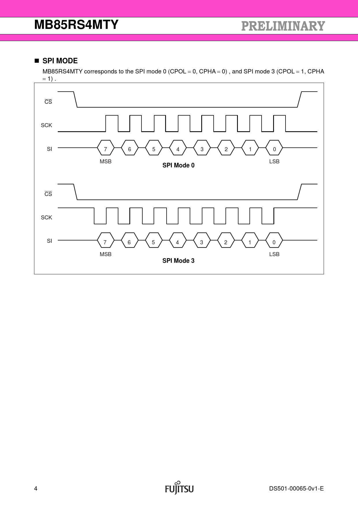 MB85RS4MTY corresponds to the SPI mode 0 (CPOL 0, CPHA 0) , and SPI mode 3 (CPOL 1, CPHA 1) . CS SCK SI 7 6 5 4 3 2 1 0 MSB LSB
