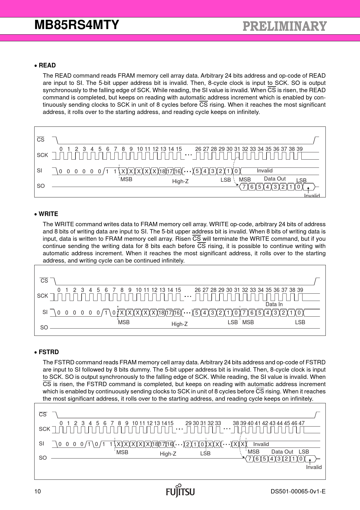 MB85RS4MTYREAD The READ command reads FRAM memory cell array data. Arbitrary 24 bits address and op-code of READ are input to SI. The 5-bit upper address bit is invalid. Then, 8-cycle clock is input to SCK. SO is output synchronously to the falling edge of SCK. While reading, the SI value is invalid. When CS is risen, the READ command is completed, but keeps on reading with automatic address increment which is enabled by con- tinuously sending clocks to SCK in unit of 8 cycles before CS rising. When it reaches the most significant address, it rolls over to the starting address, and reading cycle keeps on infinitely. CS 0 1 2 3 4 5 6 7 8 9 10 11 12 13 14 15 26 27 28 29 30 31 32 33 34 35 36 37 38 39 SCK SI 0 0 0 0 0 0 1 1 X X X X X 18 17 16 5 4 3 2 1 0 Invalid MSB LSB MSB Data Out High-Z LSB SO 7 6 5 4 3 2 1 0 Invalid WRITE The WRITE command writes data to FRAM memory cell array. WRITE op-code, arbitrary 24 bits of address and 8 bits of writing data are input to SI. The 5-bit upper address bit is invalid. When 8 bits of writing data is input, data is written to FRAM memory cell array. Risen CS will terminate the WRITE command, but if you continue sending the writing data for 8 bits each before CS rising, it is possible to continue writing with automatic address increment. When it reaches the most significant address, it rolls over to the starting address, and writing cycle can be continued infinitely. CS 0 1 2 3 4 5 6 7 8 9 10 11 12 13 14 15 26 27 28 29 30 31 32 33 34 35 36 37 38 39 SCK Data In SI 0 0 0 0 0 0 1 0 X X X X X 18 17 16 5 4 3 2 1 0 7 6 5 4 3 2 1 0 MSB LSB MSB LSB High-Z SO FSTRD The FSTRD command reads FRAM memory cell array data. Arbitrary 24 bits address and op-code of FSTRD are input to SI followed by 8 bits dummy. The 5-bit upper address bit is invalid. Then, 8-cycle clock is input to SCK. SO is output synchronously to the falling edge of SCK. While reading, the SI value is invalid. When CS is risen, the FSTRD command is completed, but keeps on reading with automatic address increment which is enabled by continuously sending clocks to SCK in unit of 8 cycles before CS rising. When it reaches the most significant address, it rolls over to the starting address, and reading cycle keeps on infinitely. CS 0 1 2 3 4 5 6 7 8 9 10 11 12 13 1415 29 30 31 32 33 38 39 40 41 42 43 44 45 46 47 SCK SI 0 0 0 0 1 0 1 1 X X X X X 18 17 16 2 1 0 X X X X Invalid MSB LSB MSB Data Out LSB High-Z SO 7 6 5 4 3 2 1 0 Invalid 10 DS501-00065-0v1-E Document Outline DESCRIPTION FEATURES PIN ASSIGNMENT PIN FUNCTIONAL DESCRIPTIONS BLOCK DIAGRAM SPI MODE SERIAL PERIPHERAL INTERFACE (SPI) STATUS REGISTER OP-CODE COMMAND BLOCK PROTECT WRITING PROTECT ABSOLUTE MAXIMUM RATINGS RECOMMENDED OPERATING CONDITIONS ELECTRICAL CHARACTERISTICS 1. DC Characteristics 2. AC Characteristics 3. Pin Capacitance TIMING DIAGRAM POWER ON/OFF SEQUENCE FRAM CHARACTERISTICS NOTE ON USE ESD AND LATCH-UP REFLOW CONDITIONS AND FLOOR LIFE Current status on Contained Restricted Substances ORDERING INFORMATION PACKAGE DIMENSION MARKING (Example) PACKING INFORMATION 1. Tube 2. Emboss Tape