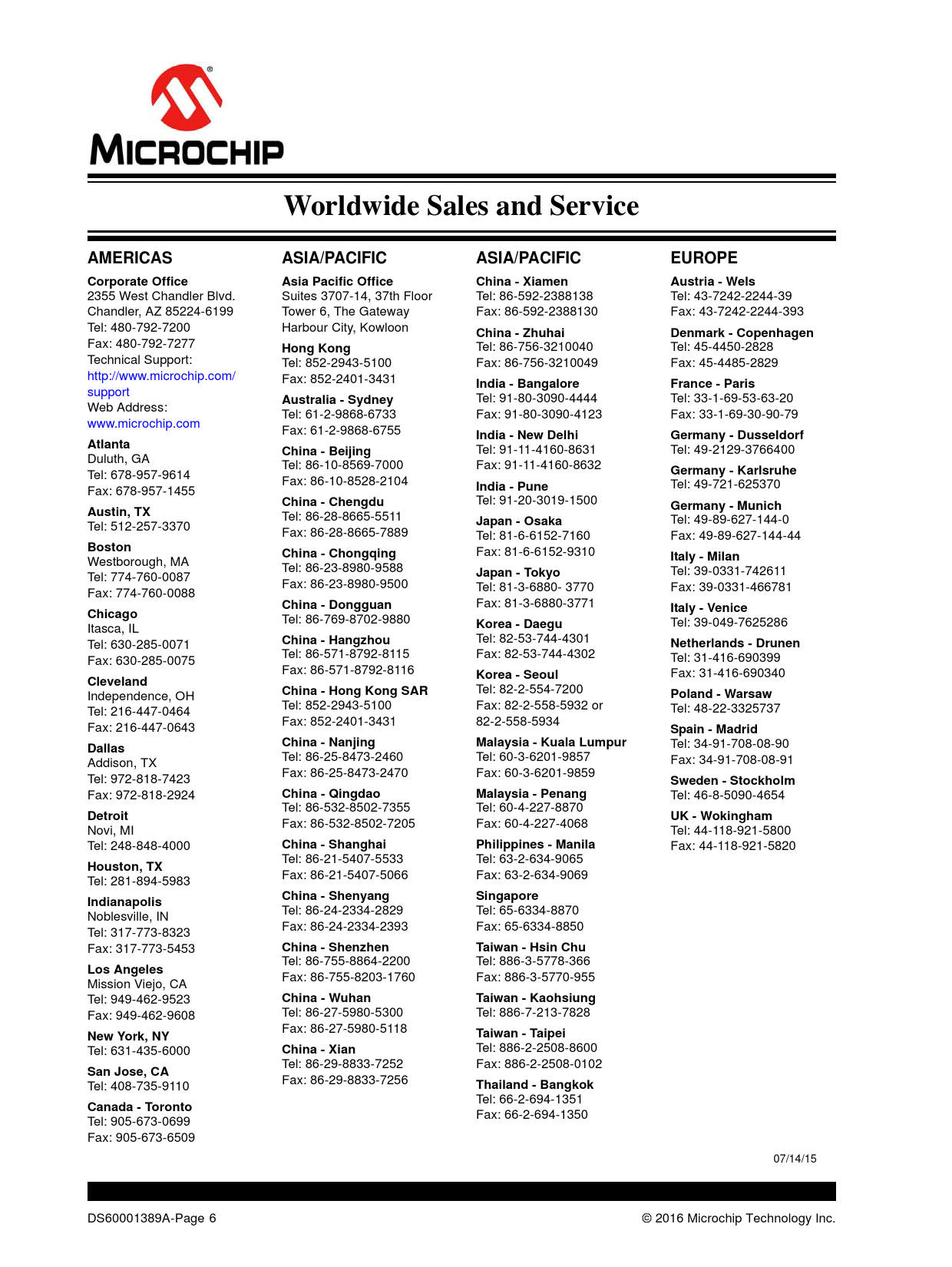 Fax: 66-2-694-1350 Tel: 905-673-0699 Fax: 905-673-6509 07/14/15 DS60001389A-Page 6 2016 Microchip Technology Inc. Document Outline Features RF/Analog DSP Audio Processing Audio Codec Peripherals HCI Interface MAC/Baseband Processor Operating Condition Compliance Applications Description