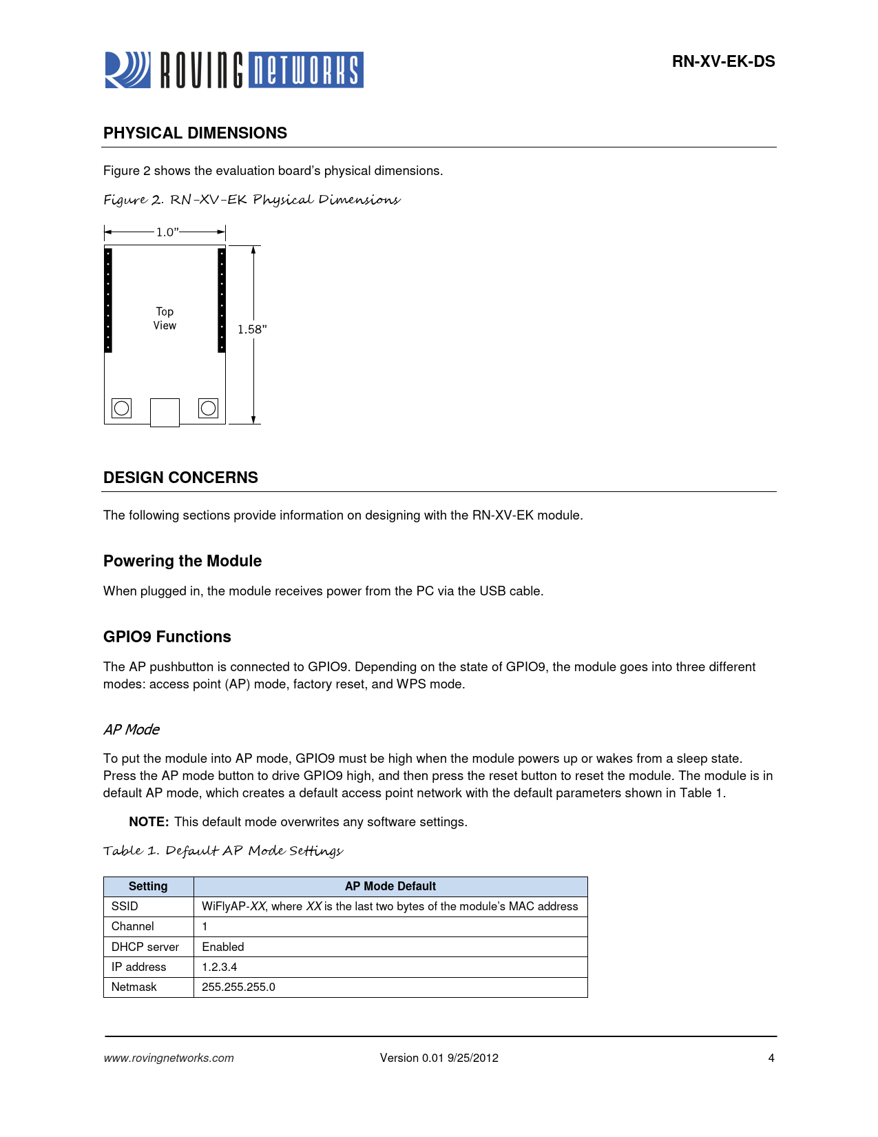 RN-XV-EK-DSPHYSICAL DIMENSIONS Figure 2 shows the evaluation board’s physical dimensions. DESIGN CONCERNS The fol owing sections provide information on designing with the RN-XV-EK module. Powering the Module When plugged in, the module receives power from the PC via the USB cable. GPIO9 Functions The AP pushbutton is connected to GPIO9. Depending on the state of GPIO9, the module goes into three different modes: access point (AP) mode, factory reset, and WPS mode. To put the module into AP mode, GPIO9 must be high when the module powers up or wakes from a sleep state. Press the AP mode button to drive GPIO9 high, and then press the reset button to reset the module. The module is in default AP mode, which creates a default access point network with the default parameters shown in Table 1. NOTE: This default mode overwrites any software settings. ! " # $ % & SettingAP Mode Default SSID WiFlyAP-XX, where XX is the last two bytes of the module’s MAC address Channel 1 DHCP server Enabled IP address 1.2.3.4 Netmask 255.255.255.0 www.rovingnetworks.com Version 0.01 9/25/2012 4