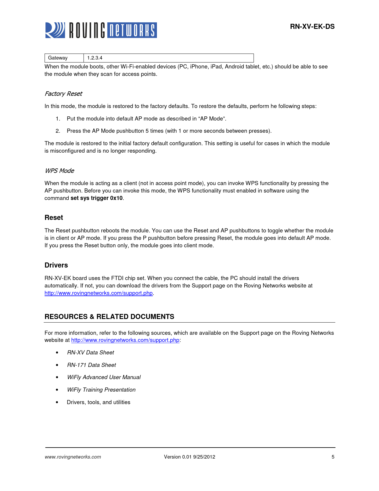 For more information, refer to the fol owing sources, which are available on the Support page on the Roving Networks website at http://www.rovingnetworks.com/support.php: • RN-XV Data Sheet • RN-171 Data Sheet • WiFly Advanced User Manual • WiFly Training Presentation • Drivers, tools, and utilities www.rovingnetworks.com Version 0.01 9/25/2012 5
