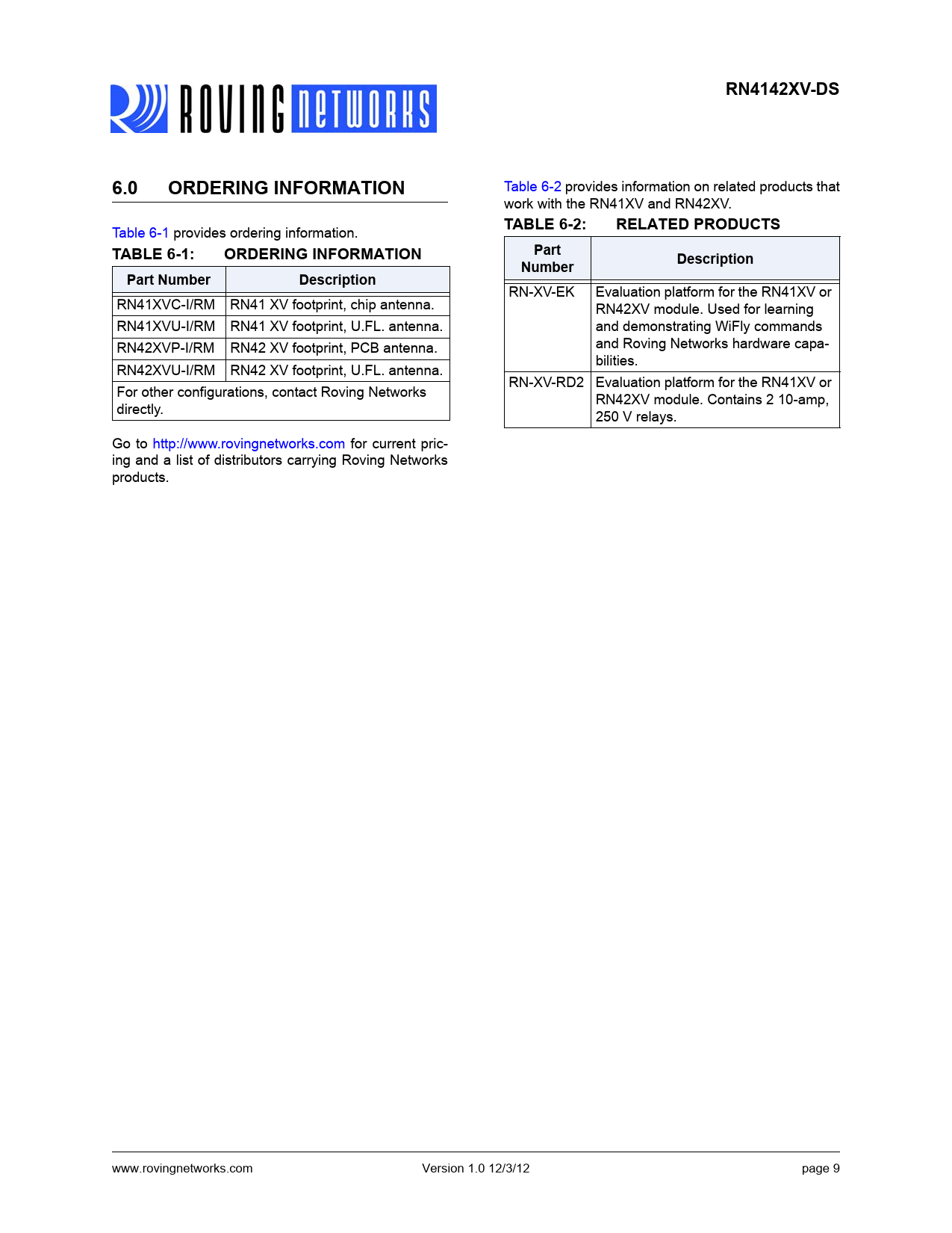 RN4142XV-DS 6.0 ORDERING INFORMATION TABLE 6-2: RELATED PRODUCTS TABLE 6-1: Part Description Number Part Number