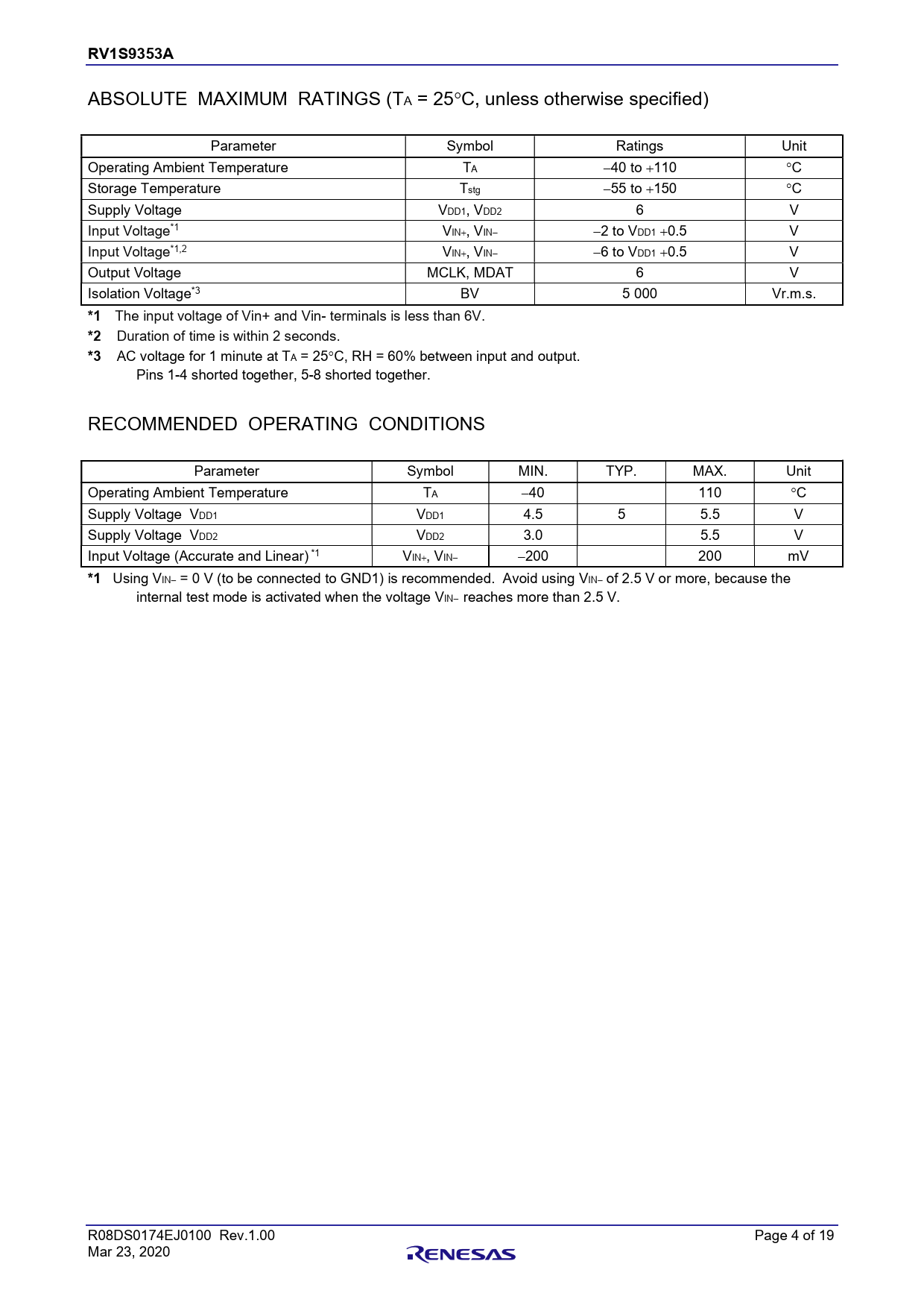 RV1S9353A Chapter Title ABSOLUTE MAXIMUM RATINGS (TA = 25C, unless otherwise specified) Parameter Symbol Ratings Unit Operating Ambient Temperature TA 40 to 110 C Storage Temperature Tstg 55 to 150 C Supply Voltage VDD1, VDD2 6 V Input Voltage*1 VIN, VIN 2 to VDD1 0.5 V Input Voltage*1,2 VIN, VIN 6 to VDD1 0.5 V Output Voltage MCLK, MDAT 6 V Isolation Voltage*3 BV 5 000 Vr.m.s. *1 The input voltage of Vin+ and Vin- terminals is less than 6V. *2 Duration of time is within 2 seconds. *3 AC voltage for 1 minute at TA = 25C, RH = 60% between input and output. Pins 1-4 shorted together, 5-8 shorted together. RECOMMENDED OPERATING CONDITIONS Parameter Symbol MIN. TYP. MAX. Unit Operating Ambient Temperature TA 40 110 C Supply Voltage VDD1 VDD1 4.5 5 5.5 V Supply Voltage VDD2 VDD2 3.0 5.5 V Input Voltage (Accurate and Linear) *1 VIN, VIN 200 200 mV *1 Using VIN = 0 V (to be connected to GND1) is recommended. Avoid using VIN of 2.5 V or more, because the internal test mode is activated when the voltage VIN reaches more than 2.5 V. R08DS0174EJ0100 Rev.1.00 Page 4 of 19 Mar 23, 2020