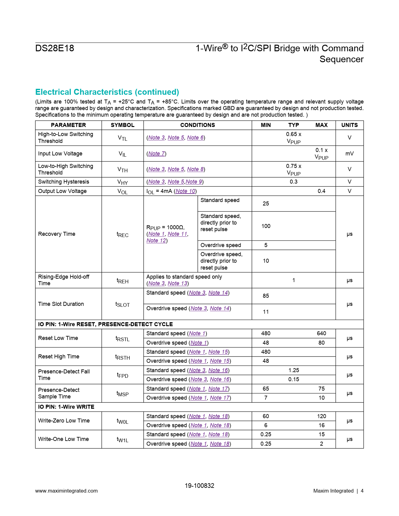Standard speed (Note 1, Note 18) 60 120 Write-Zero Low Time tW0L μs Overdrive speed (Note 1, Note 18) 6 16 Standard speed (Note 1, Note 18) 0.25 15 Write-One Low Time tW1L μs Overdrive speed (Note 1, Note 18) 0.25 2 19-100832 www.maximintegrated.com Maxim Integrated | 4 Document Outline General Description Applications Benefits and Features Simplified Application Block Diagram Absolute Maximum Ratings Package Information 8 TDFN-EP Electrical Characteristics Electrical Characteristics (continued) Typical Operating Characteristics Pin Configuration DS28E18 Pin Description Functional Diagram Block Diagram Detailed Description 64-Bit ROM ID Power-Up ROM ID Serialization 1-Wire Bus System Hardware Configuration Transaction Sequence Initialization 1-Wire ROM Function Commands Search ROM [F0h] Read ROM [33h] Match ROM [55h] Skip ROM [CCh] Resume [A5h] Overdrive-Skip ROM [3Ch] Overdrive-Match ROM [69h] 1-Wire Signaling and Timing Read/Write Time Slots Master-to-Slave Slave-to-Master Improved Network Behavior Device Function Commands Command Start (66h) Write Sequencer Command (11h) Read Sequencer Command (22h) Run Sequencer Command (33h) Device Configuration and Status Commands Write Configuration Command (55h) Read Configuration Command (6Ah) Write GPIO Configuration (83h) Read GPIO Configuration (7Ch) Device Status Command (7Ah) Sequencer Commands I2C Sequencer Interface Commands I2C Start Command I2C Stop Command I2C Write Data Command I2C Read Data Command I2C Read Data with NACK End Command SPI Sequencer Commands SPI Write/Read Byte(s) Command SPI Write/Read Bit(s) Command SS_HIGH Command SS_LOW Command Sequencer Utility Commands GPIO_CTRL Write Command GPIO_CTRL Read Command GPIO_BUF Write Command GPIO_BUF Read Command Delay Command SENS_VDD On Command SENS_VDD Off Command I2C Overview I2C Definitions Bus Idle or Not Busy START Condition STOP Condition Repeated START Condition Data Valid SPI Overview SPI Timing SPI Timing Diagram Power-Up of GPIO/I2C Pins Timeout Typical Application Circuits DS28E18 Configured as an I2C Master Typical Application Circuits (continued) DS28E18 Configured as an SPI Master Ordering Information Revision History