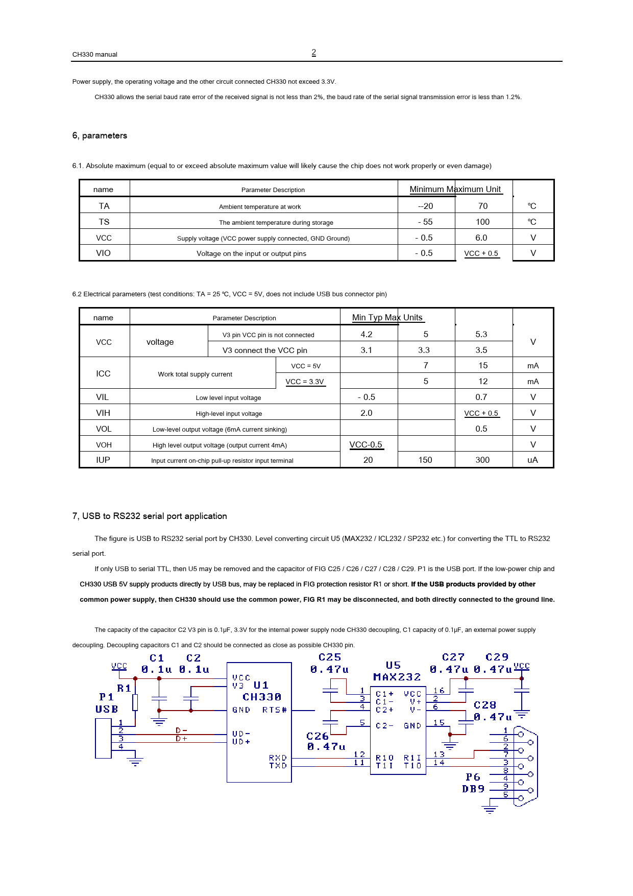The capacity of the capacitor C2 V3 pin is 0.1μF, 3.3V for the internal power supply node CH330 decoupling, C1 capacity of 0.1μF, an external power supply decoupling. Decoupling capacitors C1 and C2 should be connected as close as possible CH330 pin. Document Outline 1、概述 2、特点 3、封装 4、引脚 5、功能说明 6、参数 6.1. 绝对最大值 6.2. 电气参数 7、USB转RS232串口应用 8、连接单片机串口,各自供电