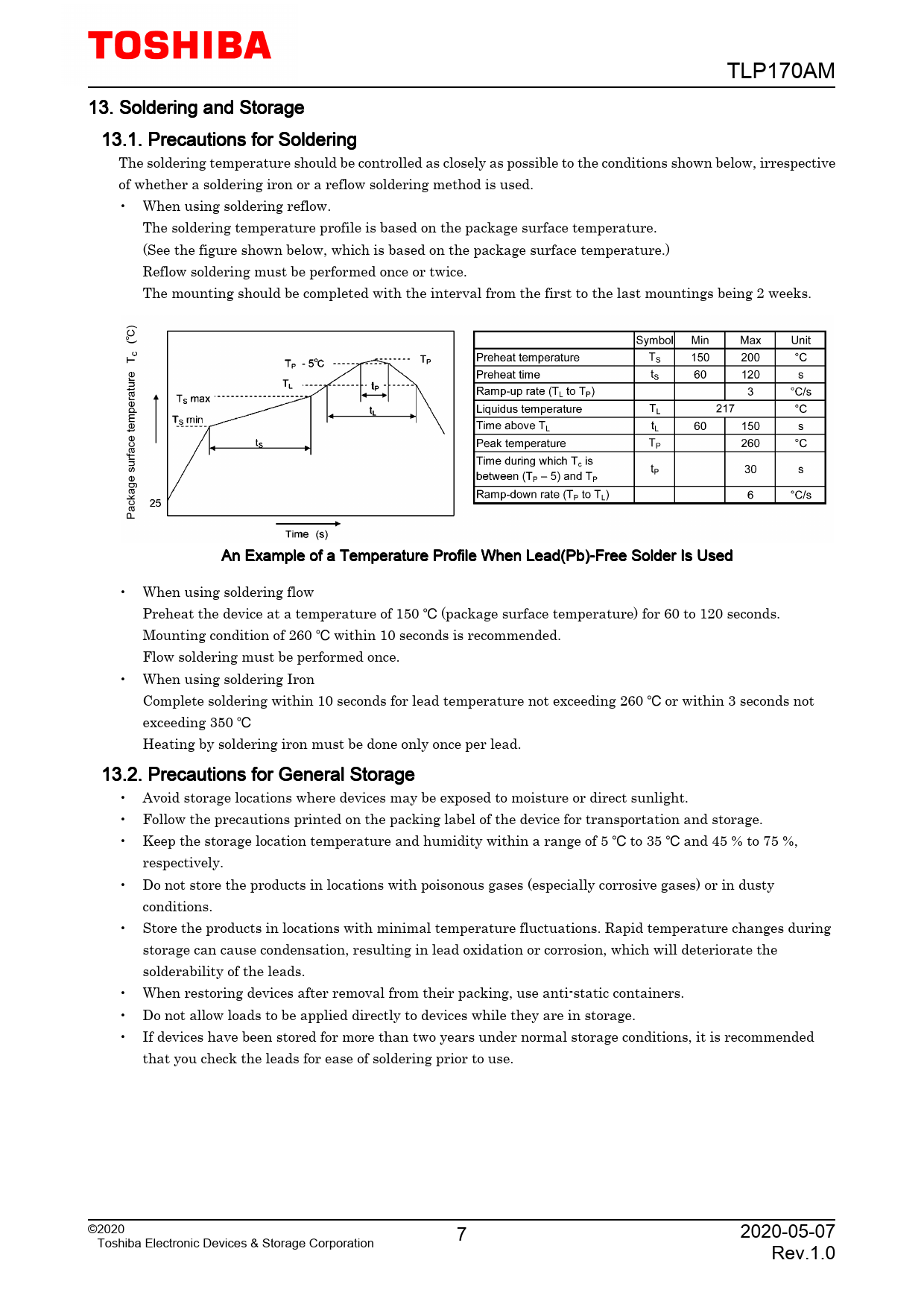 TLP170AM 13. Soldering and Storage 13.1. Precautions for Soldering The soldering temperature should be controlled as closely as possible to the conditions shown below, irrespective of whether a soldering iron or a reflow soldering method is used. • When using soldering reflow. The soldering temperature profile is based on the package surface temperature. (See the figure shown below, which is based on the package surface temperature.) Reflow soldering must be performed once or twice. The mounting should be completed with the interval from the first to the last mountings being 2 weeks. An Example of a Temperature Profile When Lead(Pb)-Free Solder Is Used • When using soldering flow Preheat the device at a temperature of 150 (package surface temperature) for 60 to 120 seconds. Mounting condition of 260 within 10 seconds is recommended. Flow soldering must be performed once. • When using soldering Iron Complete soldering within 10 seconds for lead temperature not exceeding 260 or within 3 seconds not exceeding 350 Heating by soldering iron must be done only once per lead. 13.2. Precautions for General Storage • Avoid storage locations where devices may be exposed to moisture or direct sunlight. • Follow the precautions printed on the packing label of the device for transportation and storage. • Keep the storage location temperature and humidity within a range of 5 to 35 and 45 % to 75 %, respectively. • Do not store the products in locations with poisonous gases (especially corrosive gases) or in dusty conditions. • Store the products in locations with minimal temperature fluctuations. Rapid temperature changes during storage can cause condensation, resulting in lead oxidation or corrosion, which will deteriorate the solderability of the leads. • When restoring devices after removal from their packing, use anti-static containers. • Do not allow loads to be applied directly to devices while they are in storage. • If devices have been stored for more than two years under normal storage conditions, it is recommended that you check the leads for ease of soldering prior to use. ©2020 7 2020-05-07 Toshiba Electronic Devices & Storage Corporation Rev.1.0