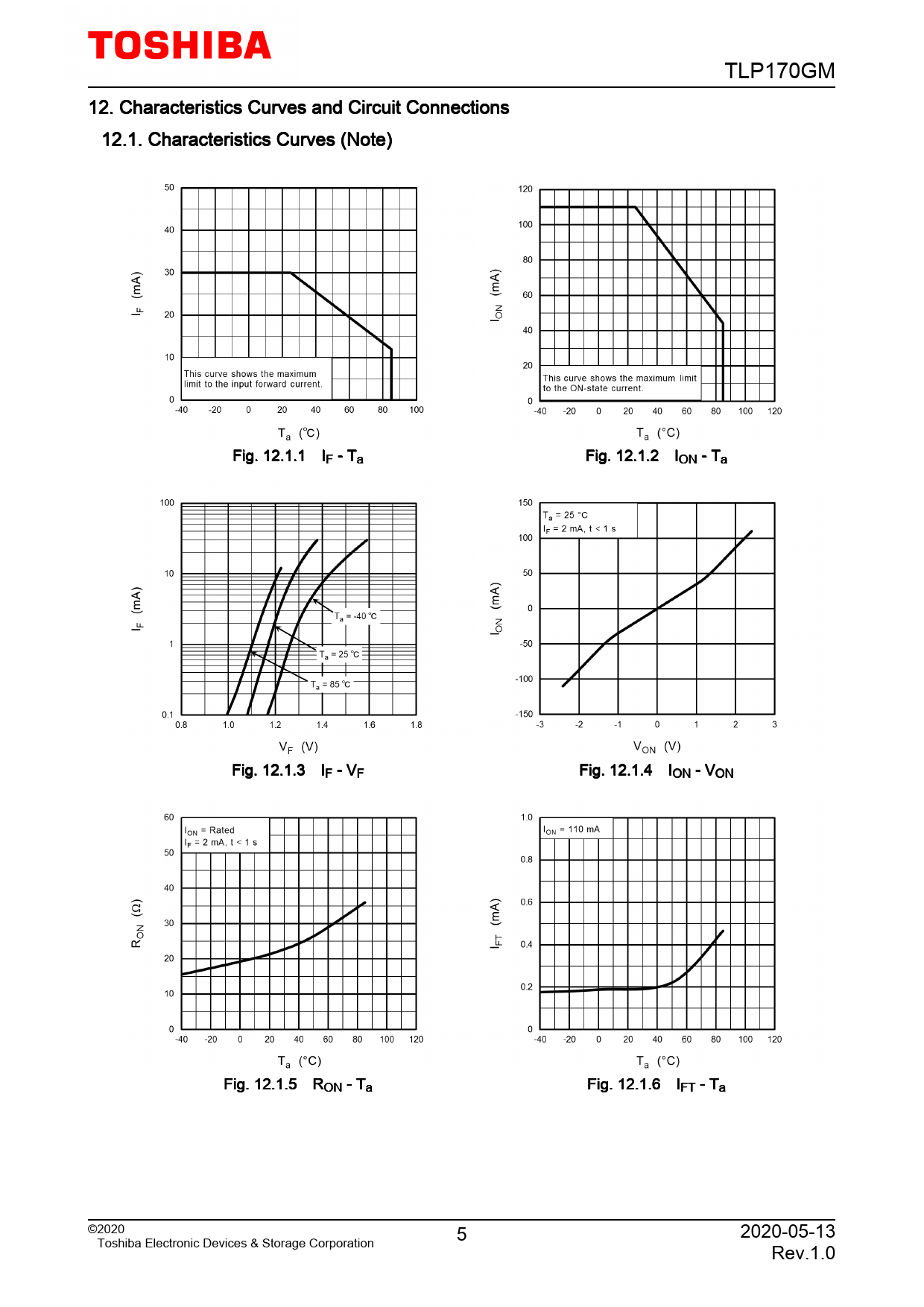 TLP170GM. 12. Characteristics. Curves. and. Circuit. Connections. 12.1. Characteristics. Curves. (Note). Fig. 12.1.1. IF. -. Ta. Fig. 12.1.2. ION. -. Ta. Fig