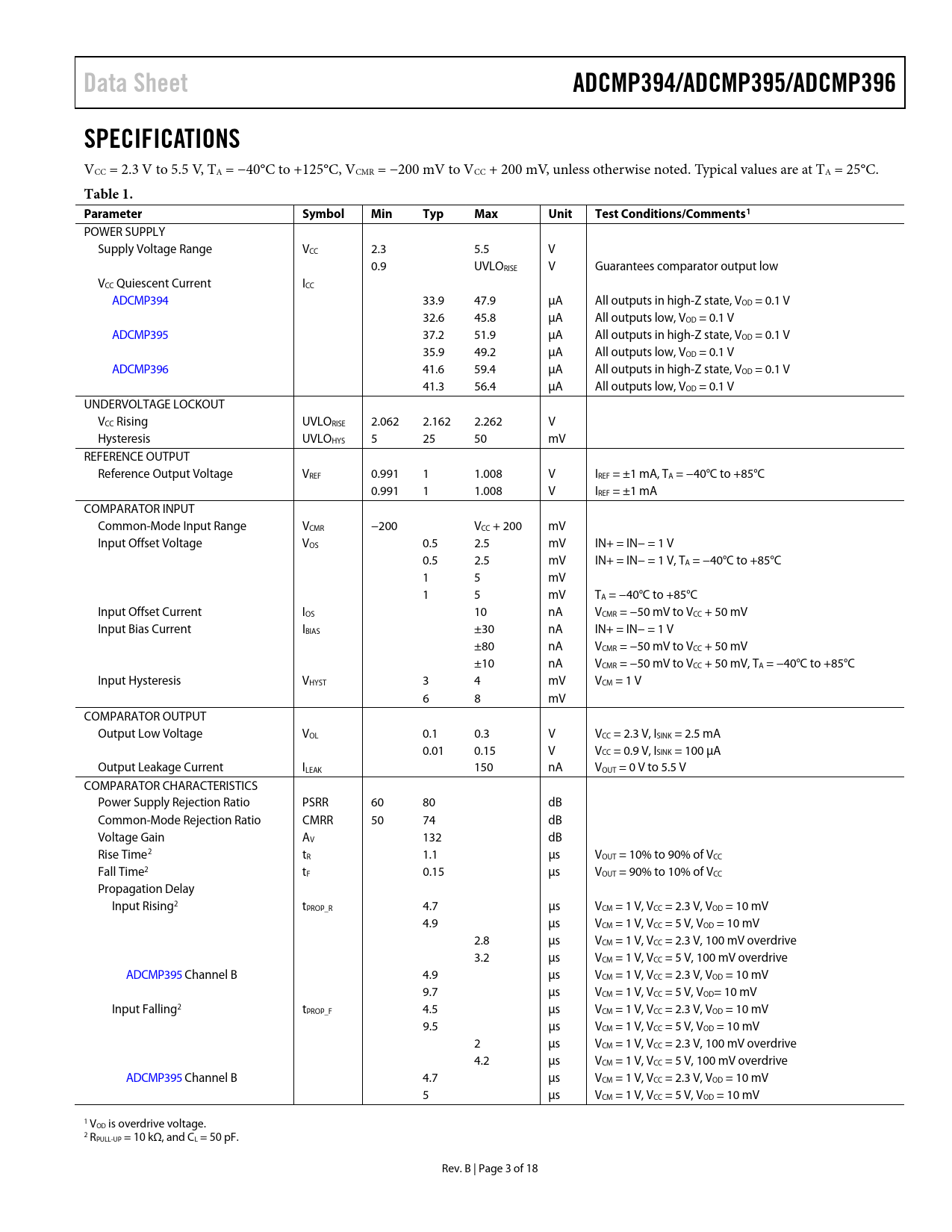 Data Sheet. ADCMP394/ADCMP395/ADCMP396. SPECIFICATIONS. Table 1. Parameter. Symbol. Min. Typ. Max. Unit. Test Conditions/Comments1