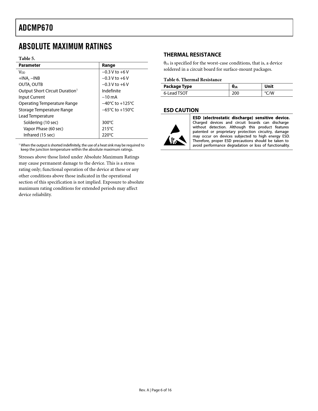 link to page 6 ADCMP670ABSOLUTE MAXIMUM RATINGSTHERMAL RESISTANCETable 5. θ Parameter Range JA is specified for the worst-case conditions, that is, a device soldered in a circuit board for surface-mount packages. VDD −0.3 V to +6 V +INA, −INB −0.3 V to +6 V Table 6. Thermal Resistance OUTA, OUTB −0.3 V to +6 V Package TypeθJA Unit Output Short Circuit Duration1 Indefinite 6-Lead TSOT 200 °C/W Input Current −10 mA Operating Temperature Range −40°C to +125°C Storage Temperature Range −65°C to +150°C ESD CAUTION Lead Temperature Soldering (10 sec) 300°C Vapor Phase (60 sec) 215°C Infrared (15 sec) 220°C 1 When the output is shorted indefinitely, the use of a heat sink may be required to keep the junction temperature within the absolute maximum ratings. Stresses above those listed under Absolute Maximum Ratings may cause permanent damage to the device. This is a stress rating only; functional operation of the device at these or any other conditions above those indicated in the operational section of this specification is not implied. Exposure to absolute maximum rating conditions for extended periods may affect device reliability. Rev. A | Page 6 of 16 Document Outline FEATURES APPLICATIONS FUNCTIONAL BLOCK DIAGRAM GENERAL DESCRIPTION TABLE OF CONTENTS REVISION HISTORY SPECIFICATIONS ABSOLUTE MAXIMUM RATINGS THERMAL RESISTANCE ESD CAUTION PIN CONFIGURATION AND FUNCTION DESCRIPTIONS TYPICAL PERFORMANCE CHARACTERISTICS APPLICATION INFORMATION COMPARATORS AND INTERNAL REFERENCE POWER SUPPLY INPUTS OUTPUTS ADDING HYSTERESIS OUTLINE DIMENSIONS ORDERING GUIDE