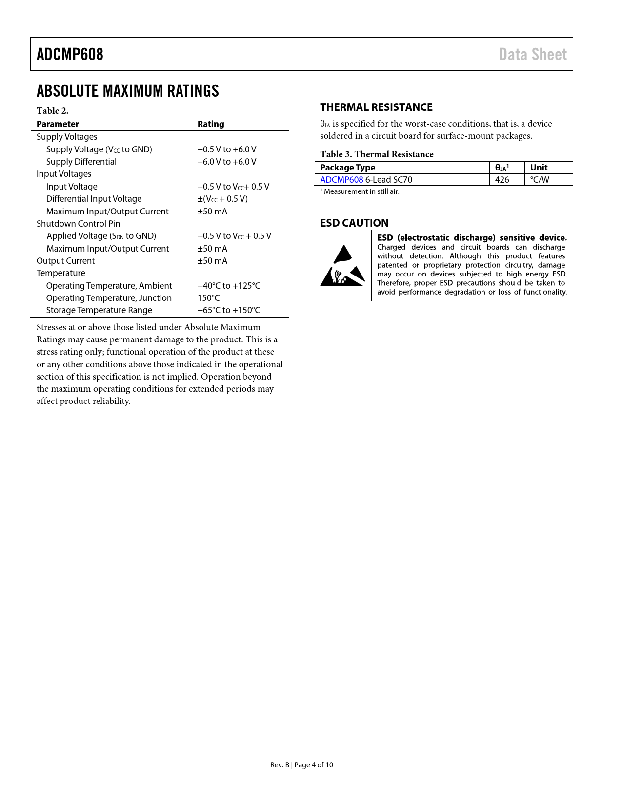 ADCMP608. Data Sheet. ABSOLUTE MAXIMUM RATINGS Table 2. THERMAL RESISTANCE. Parameter Rating. Table 3. Thermal Resistance