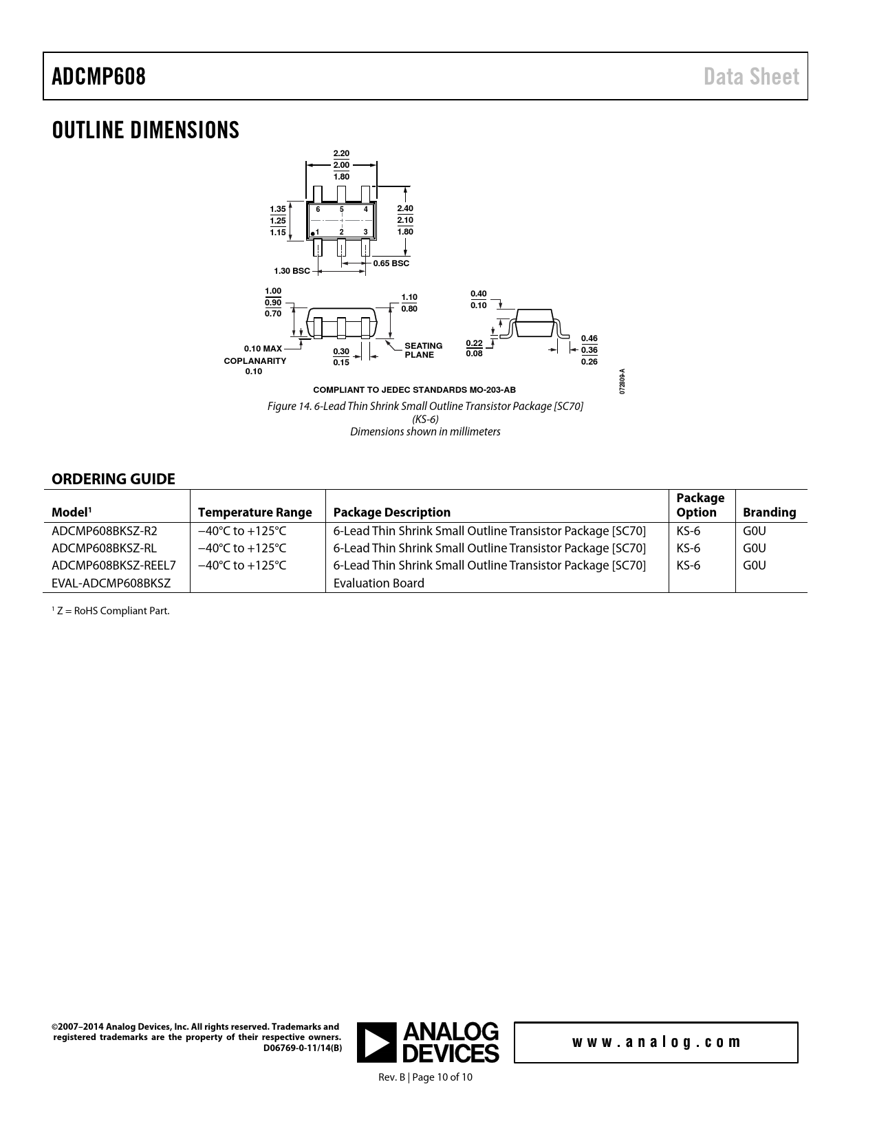 ADCMP608BKSZ-R2 −40°C to +125°C 6-Lead Thin Shrink Small Outline Transistor Package [SC70] KS-6 G0U ADCMP608BKSZ-RL −40°C to +125°C 6-Lead Thin Shrink Small Outline Transistor Package [SC70] KS-6 G0U ADCMP608BKSZ-REEL7 −40°C to +125°C 6-Lead Thin Shrink Small Outline Transistor Package [SC70] KS-6 G0U EVAL-ADCMP608BKSZ Evaluation Board 1 Z = RoHS Compliant Part.