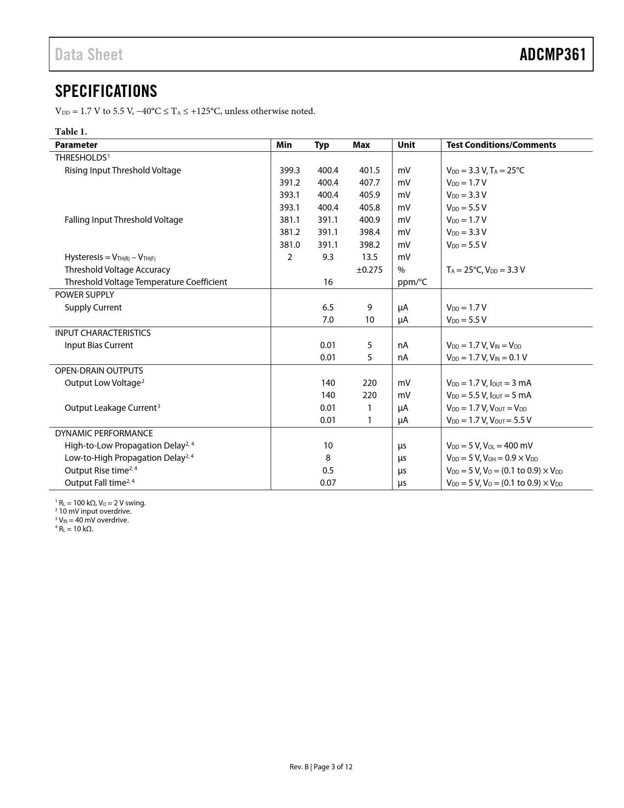 Data Sheet. ADCMP361. SPECIFICATIONS. Table 1. Parameter. Min. Typ. Max. Unit. Test Conditions/Comments