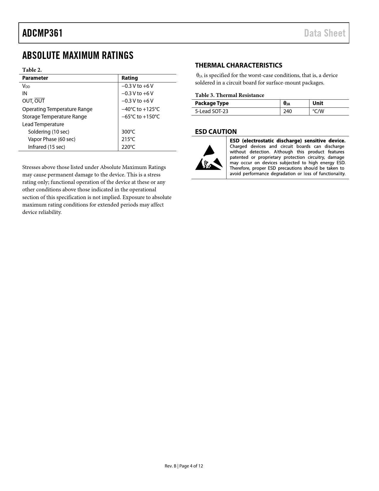 ADCMP361 Data Sheet ABSOLUTE MAXIMUM RATINGS THERMAL CHARACTERISTICS Table 2 Parameter Rating Table 3 Thermal Resistance