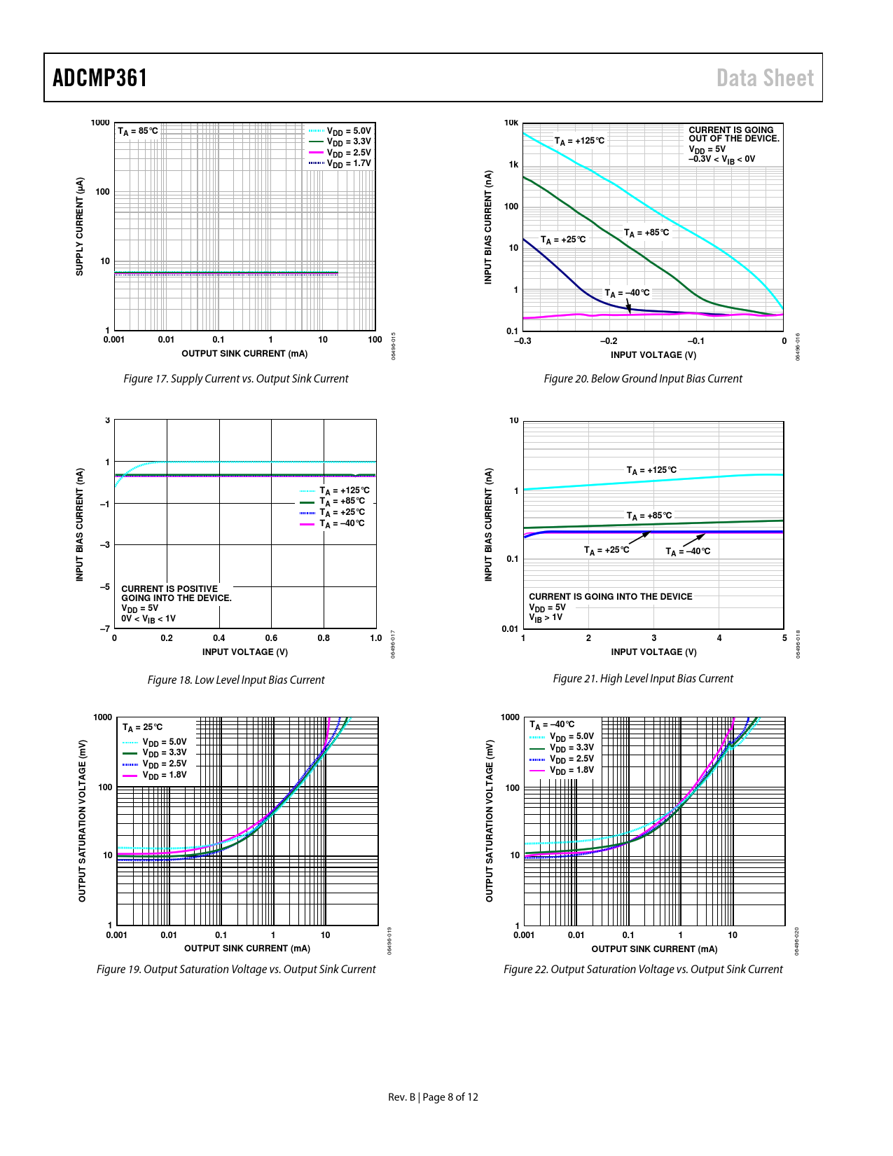 ADCMP361. Data Sheet. 1000. 10k. A = 85°C. DD = 5.0V. CURRENT IS GOING. OUT OF THE DEVICE. DD = 3.3V. A = +125°C. DD = 2.5V. DD = 5V