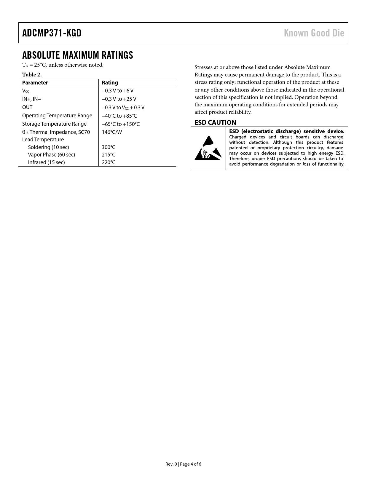 ADCMP371-KGDKnown Good DieABSOLUTE MAXIMUM RATINGS TA = 25°C, unless otherwise noted. Stresses at or above those listed under Absolute Maximum Table 2. Ratings may cause permanent damage to the product. This is a ParameterRating stress rating only; functional operation of the product at these VCC −0.3 V to +6 V or any other conditions above those indicated in the operational IN+, IN− −0.3 V to +25 V section of this specification is not implied. Operation beyond OUT −0.3 V to V the maximum operating conditions for extended periods may CC + 0.3 V affect product reliability. Operating Temperature Range −40°C to +85°C Storage Temperature Range −65°C to +150°C ESD CAUTION θJA Thermal Impedance, SC70 146°C/W Lead Temperature Soldering (10 sec) 300°C Vapor Phase (60 sec) 215°C Infrared (15 sec) 220°C Rev. 0 | Page 4 of 6 Document Outline FEATURES APPLICATIONS GENERAL DESCRIPTION FUNCTIONAL BLOCK DIAGRAM TABLE OF CONTENTS REVISION HISTORY SPECIFICATIONS ABSOLUTE MAXIMUM RATINGS ESD CAUTION PIN CONFIGURATION AND FUNCTION DESCRIPTIONS OUTLINE DIMENSIONS DIE SPECIFICATIONS AND ASSEMBLY RECOMMENDATIONS ORDERING GUIDE
