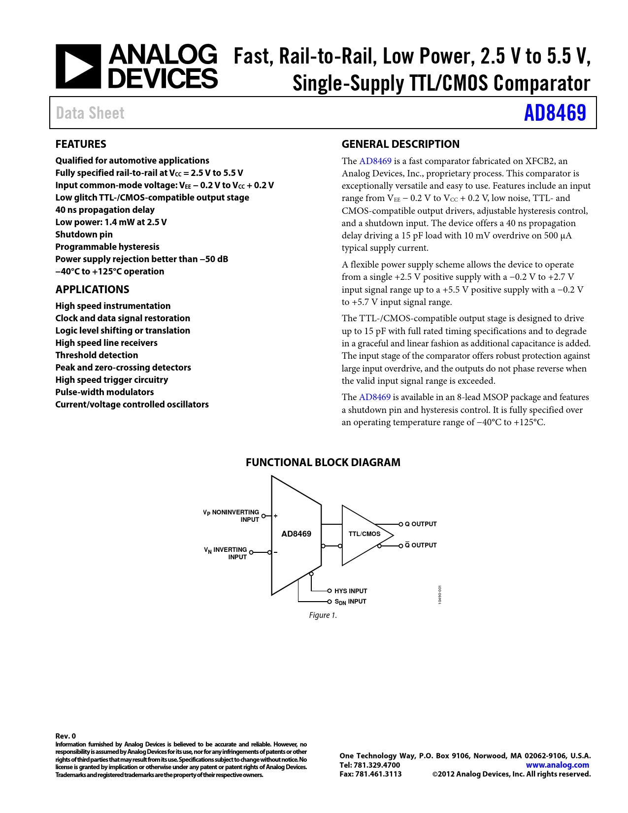 Fast, Rail-to-Rail, Low Power, 2.5 V to 5.5 V,. Single-Supply TTL/CMOS Comparator. Data Sheet. AD8469. FEATURES