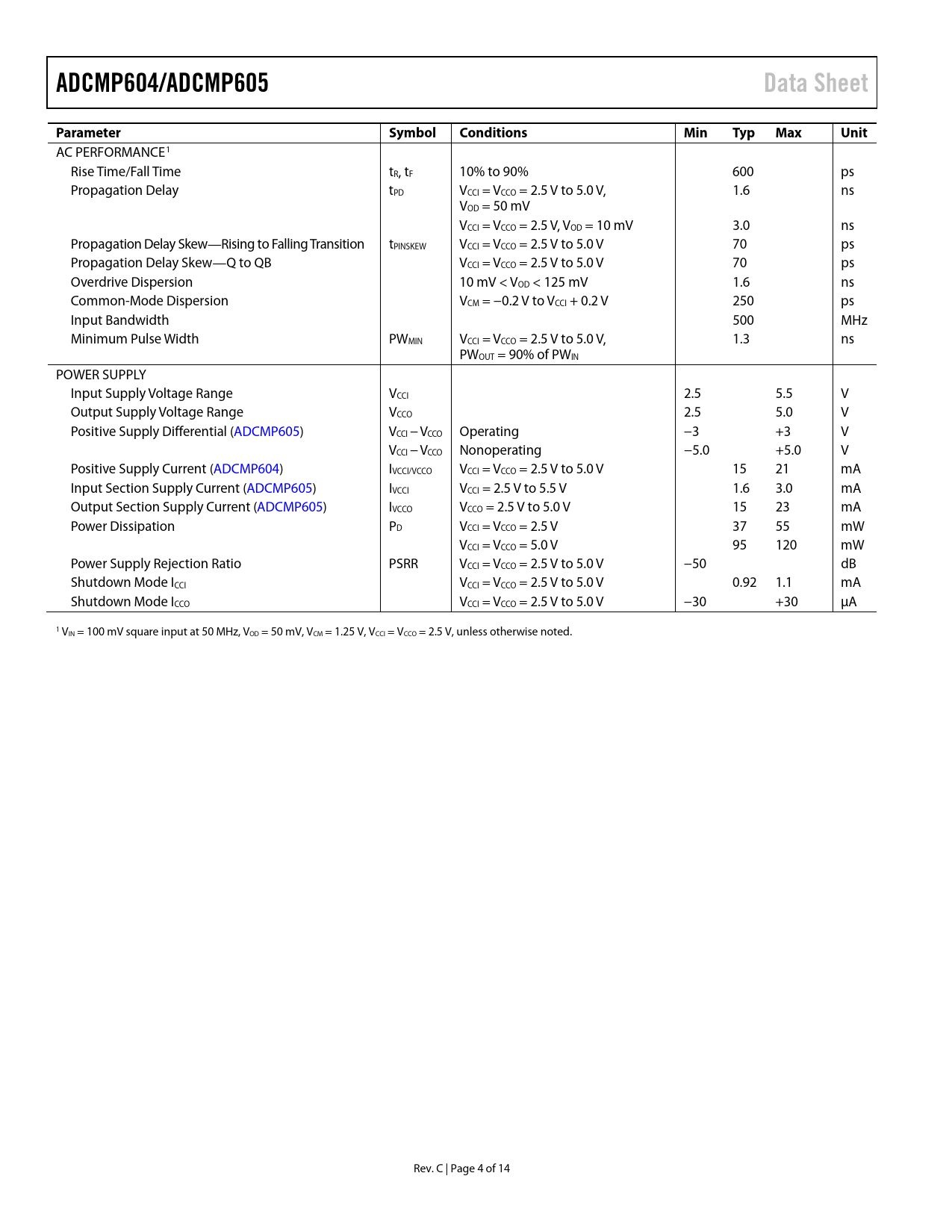 ADCMP604/ADCMP605 Data Sheet Parameter Symbol Conditions Min Typ Max Unit