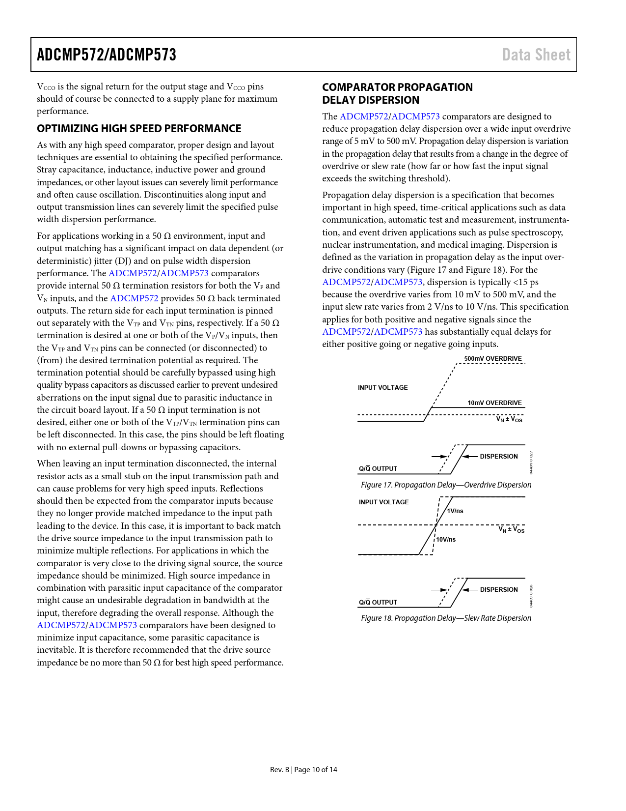 link to page 10 link to page 10 ADCMP572/ADCMP573Data Sheet VCCO is the signal return for the output stage and VCCO pins COMPARATOR PROPAGATION should of course be connected to a supply plane for maximum DELAY DISPERSION performance. The ADCMP572/ADCMP573 comparators are designed to OPTIMIZING HIGH SPEED PERFORMANCE reduce propagation delay dispersion over a wide input overdrive As with any high speed comparator, proper design and layout range of 5 mV to 500 mV. Propagation delay dispersion is variation techniques are essential to obtaining the specified performance. in the propagation delay that results from a change in the degree of Stray capacitance, inductance, inductive power and ground overdrive or slew rate (how far or how fast the input signal impedances, or other layout issues can severely limit performance exceeds the switching threshold). and often cause oscillation. Discontinuities along input and Propagation delay dispersion is a specification that becomes output transmission lines can severely limit the specified pulse important in high speed, time-critical applications such as data width dispersion performance. communication, automatic test and measurement, instrumenta- For applications working in a 50 Ω environment, input and tion, and event driven applications such as pulse spectroscopy, output matching has a significant impact on data dependent (or nuclear instrumentation, and medical imaging. Dispersion is deterministic) jitter (DJ) and on pulse width dispersion defined as the variation in propagation delay as the input over- performance. The ADCMP572/ADCMP573 comparators drive conditions vary (Figure 17 and Figure 18). For the provide internal 50 Ω termination resistors for both the V ADCMP572/ADCMP573, dispersion is typically <15 ps P and V because the overdrive varies from 10 mV to 500 mV, and the N inputs, and the ADCMP572 provides 50 Ω back terminated outputs. The return side for each input termination is pinned input slew rate varies from 2 V/ns to 10 V/ns. This specification out separately with the V applies for both positive and negative signals since the TP and VTN pins, respectively. If a 50 Ω termination is desired at one or both of the V ADCMP572/ADCMP573 has substantially equal delays for P/VN inputs, then the V either positive going or negative going inputs. TP and VTN pins can be connected (or disconnected) to (from) the desired termination potential as required. The 500mV OVERDRIVE termination potential should be carefully bypassed using high quality bypass capacitors as discussed earlier to prevent undesired INPUT VOLTAGE aberrations on the input signal due to parasitic inductance in 10mV OVERDRIVE the circuit board layout. If a 50 Ω input termination is not desired, either one or both of the V VN ± VOS TP/VTN termination pins can be left disconnected. In this case, the pins should be left floating with no external pull-downs or bypassing capacitors. DISPERSION When leaving an input termination disconnected, the internal Q/Q OUTPUT resistor acts as a small stub on the input transmission path and 04409-0-027 can cause problems for very high speed inputs. Reflections Figure 17. Propagation Delay—Overdrive Dispersion should then be expected from the comparator inputs because INPUT VOLTAGE they no longer provide matched impedance to the input path 1V/ns leading to the device. In this case, it is important to back match VN ± VOS the drive source impedance to the input transmission path to 10V/ns minimize multiple reflections. For applications in which the comparator is very close to the driving signal source, the source impedance should be minimized. High source impedance in combination with parasitic input capacitance of the comparator DISPERSION might cause an undesirable degradation in bandwidth at the Q/Q OUTPUT 04409-0-028 input, therefore degrading the overall response. Although the Figure 18. Propagation Delay—Slew Rate Dispersion ADCMP572/ADCMP573 comparators have been designed to minimize input capacitance, some parasitic capacitance is inevitable. It is therefore recommended that the drive source impedance be no more than 50 Ω for best high speed performance. Rev. B | Page 10 of 14 Document Outline FEATURES APPLICATIONS FUNCTIONAL BLOCK DIAGRAM GENERAL DESCRIPTION TABLE OF CONTENTS REVISION HISTORY ELECTRICAL CHARACTERISTICS ABSOLUTE MAXIMUM RATINGS THERMAL CONSIDERATIONS ESD CAUTION PIN CONFIGURATION AND FUNCTION DESCRIPTIONS TYPICAL PERFORMANCE CHARACTERISTICS APPLICATIONS INFORMATION POWER/GROUND LAYOUT AND BYPASSING CML/RSPECL OUTPUT STAGE USING/DISABLING THE LATCH FEATURE OPTIMIZING HIGH SPEED PERFORMANCE COMPARATOR PROPAGATIONDELAY DISPERSION COMPARATOR HYSTERESIS MINIMUM INPUT SLEW RATE REQUIREMENTS TYPICAL APPLICATION CIRCUITS TIMING INFORMATION OUTLINE DIMENSIONS ORDERING GUIDE