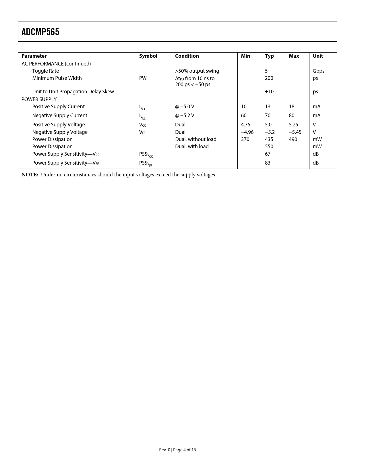 ADCMP565 Parameter SymbolConditionMinTypMaxUnit AC PERFORMANCE (continued) Toggle Rate >50% output swing 5 Gbps Minimum Pulse Width PW ∆tPD from 10 ns to 200 ps 200 ps < ±50 ps Unit to Unit Propagation Delay Skew ±10 ps POWER SUPPLY Positive Supply Current IV @ +5.0 V 10 13 18 mA CC Negative Supply Current IV @ −5.2 V 60 70 80 mA EE Positive Supply Voltage VCC Dual 4.75 5.0 5.25 V Negative Supply Voltage VEE Dual −4.96 −5.2 −5.45 V Power Dissipation Dual, without load 370 435 490 mW Power Dissipation Dual, with load 550 mW Power Supply Sensitivity—VCC PSSV 67 dB CC Power Supply Sensitivity—VEE PSSV 83 dB EE NOTE: Under no circumstances should the input voltages exceed the supply voltages. Rev. 0 | Page 4 of 16 Document Outline SPECIFICATIONS ABSOLUTE MAXIMUM RATINGS THERMAL CONSIDERATIONS ESD CAUTION PIN CONFIGURATION AND FUNCTION DESCRIPTIONS TIMING INFORMATION APPLICATION INFORMATION CLOCK TIMING RECOVERY OPTIMIZING HIGH SPEED PERFORMANCE COMPARATOR PROPAGATION DELAY DISPERSION COMPARATOR HYSTERESIS MINIMUM INPUT SLEW RATE REQUIREMENT TYPICAL APPLICATION CIRCUITS TYPICAL PERFORMANCE CHARACTERISTICS OUTLINE DIMENSIONS ORDERING GUIDE