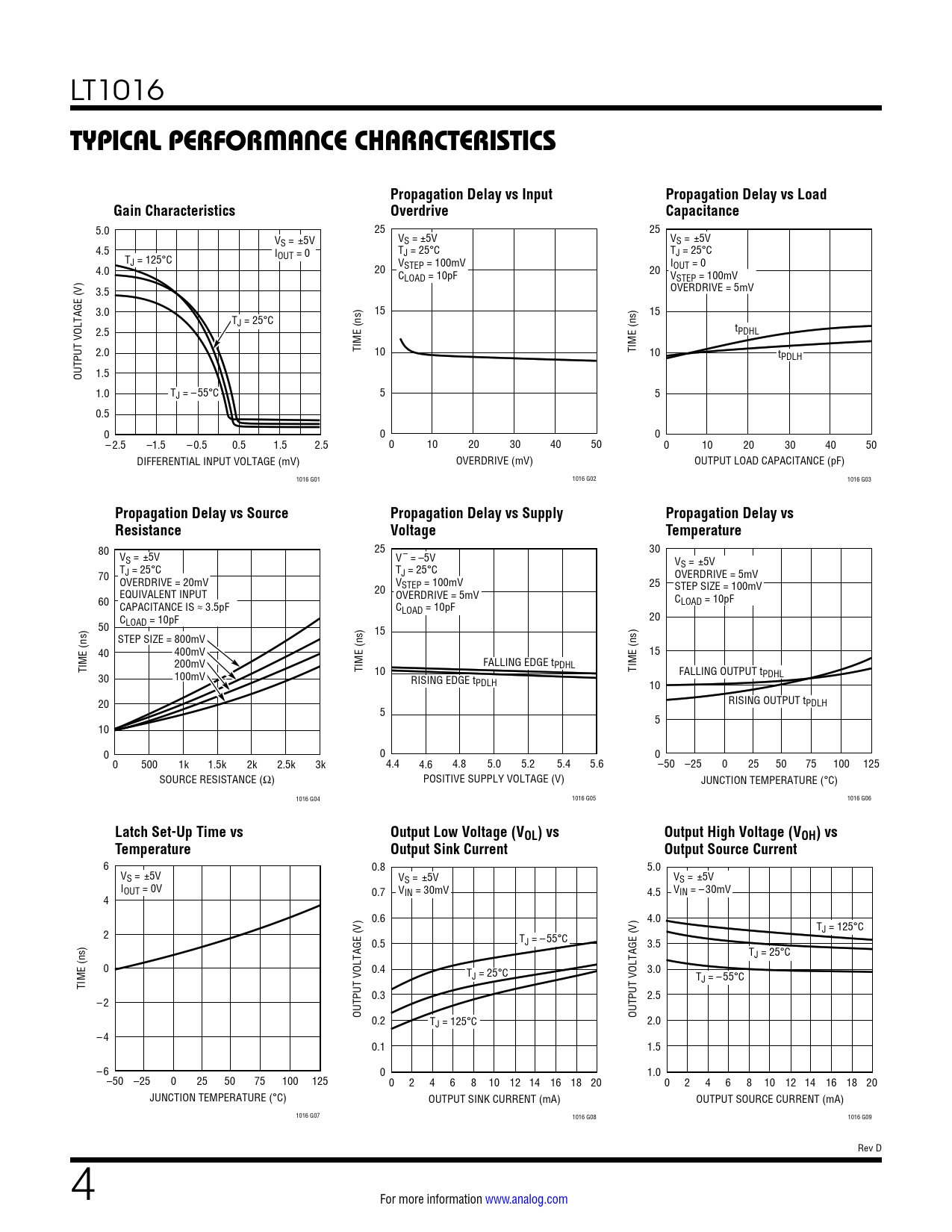 5.0 25 25 VS = ±5V VS = ±5V VS = ±5V 4.5 T T T IOUT = 0 J = 25°C J = 25°C J = 125°C V I 4.0 20 STEP = 100mV OUT = 0 C 20 LOAD = 10pF VSTEP = 100mV 3.5 OVERDRIVE = 5mV 3.0 15 15 TJ = 25°C 2.5 tPDHL 2.0 TIME (ns) 10 TIME (ns) 10 tPDLH 1.5 OUTPUT VOLTAGE (V) 1.0 TJ = –55°C 5 5 0.5 0 0 0 –2.5 –1.5 –0.5 0.5 1.5 2.5 0 10 20 30 40 50 0 10 20 30 40 50 DIFFERENTIAL INPUT VOLTAGE (mV) OVERDRIVE (mV) OUTPUT LOAD CAPACITANCE (pF) 1016 G01 1016 G02 1016 G03