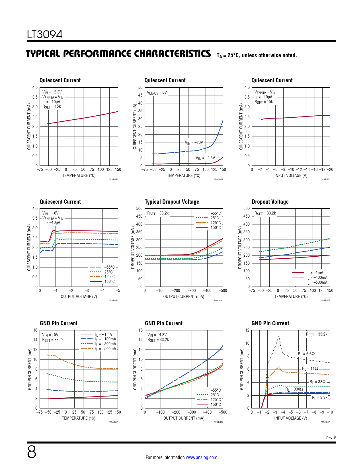 16 16 12 VIN = –5V IL = –1mA VIN = –4.3V RSET = 33.2k 14 RSET = 33.2k IL = –100mA 14 RSET = 33.2k IL = –300mA 10 I 12 L = –500mA 12 RL = 6.6Ω 8 10 10 8 8 6 RL = 11Ω 6 6 4 RL = 33Ω GND PIN CURRENT (mA) 4 GND PIN CURRENT (mA) 4 –55°C GND PIN CURRENT (mA) RL = 330Ω 25°C 2 2 2 125°C RL = 3.3k 150°C 0 0 0 –75 –50 –25 0 25 50 75 100 125 150 0 –100 –200 –300 –400 –500 0 –1 –2 –3 –4 –5 –6 –7 –8 –9 –10 TEMPERATURE (°C) OUTPUT CURRENT (mA) INPUT VOLTAGE (V) 3094 G16 3094 G17 3094 G18 Rev. B 8 For more information www.analog.com Document Outline Features Applications Typical Application Description Absolute Maximum Ratings Pin Configuration Order Information Electrical Characteristics Typical Performance Characteristics Pin Functions Block Diagram Applications Information Typical Applications Package Description Revision History Typical Application Related Parts