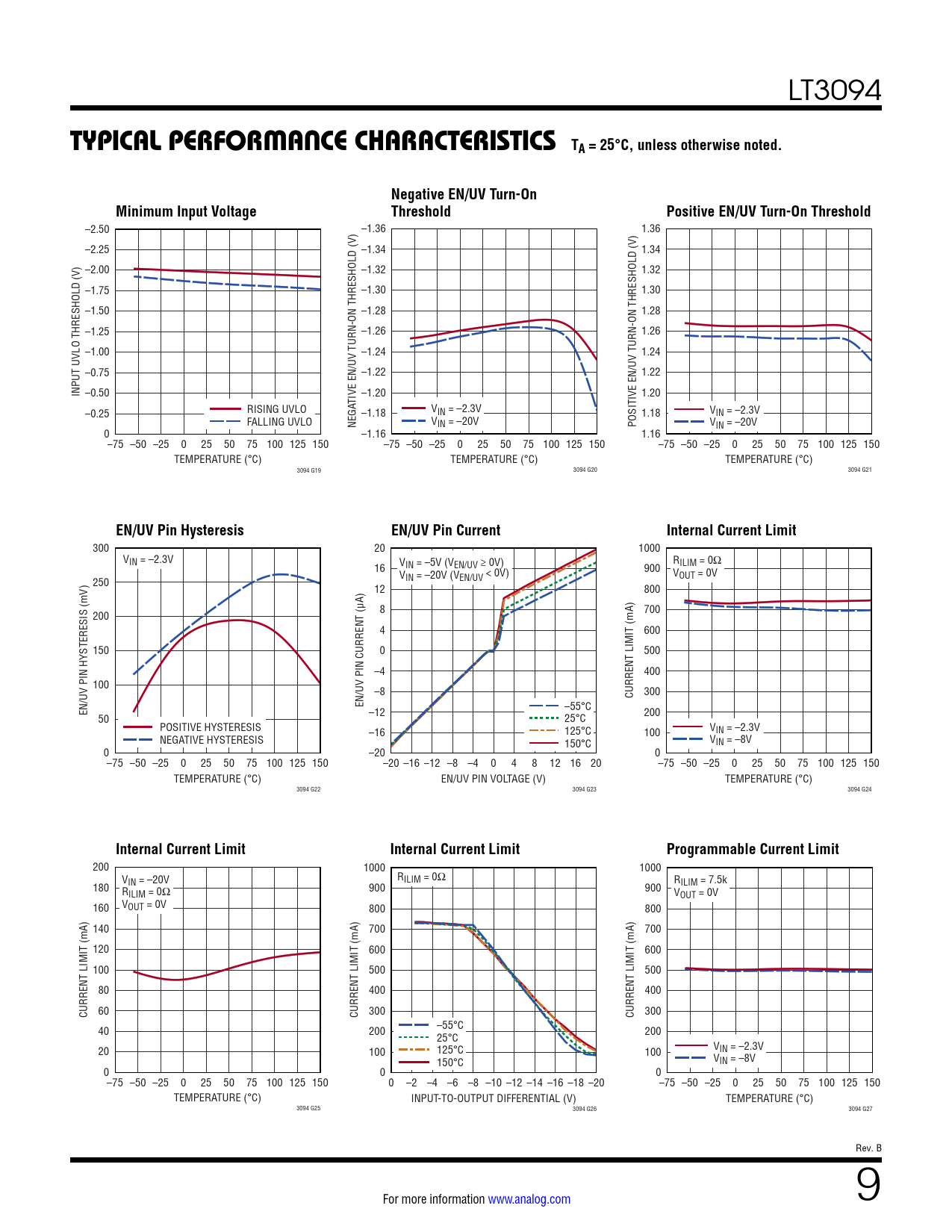 300 20 1000 VIN = –2.3V VIN = –5V (VEN/UV ≥ 0V) R 16 ILIM = 0Ω V 900 V 250 IN = –20V (VEN/UV < 0V) OUT = 0V 12 800 8 700 200 4 600 150 0 500 –4 400 100 –8 300 CURRENT LIMIT (mA) EN/UV PIN CURRENT (µA) EN/UV PIN HYSTERESIS (mV) –55°C –12 200 50 25°C POSITIVE HYSTERESIS –16 125°C VIN = –2.3V 100 NEGATIVE HYSTERESIS 150°C VIN = –8V 0 –20 0 –75 –50 –25 0 25 50 75 100 125 150 –20 –16 –12 –8 –4 0 4 8 12 16 20 –75 –50 –25 0 25 50 75 100 125 150 TEMPERATURE (°C) EN/UV PIN VOLTAGE (V) TEMPERATURE (°C) 3094 G22 3094 G23 3094 G24