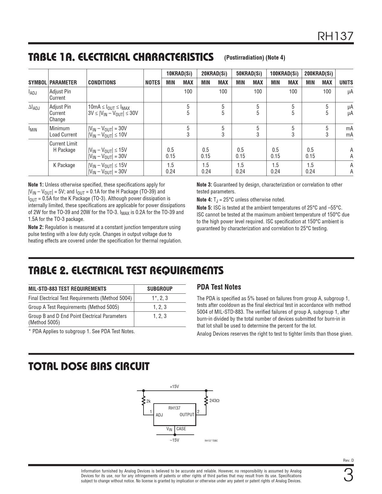 +15V 2k 243Ω RH137 1 2 ADJ OUTPUT VIN CASE –15V RH137 TDBC Rev. D Information furnished by Analog Devices is believed to be accurate and reliable. However, no responsibility is assumed by Analog Devices for its use, nor for any infringements of patents or other rights of third parties that may result from its use. Specifications For more information www.a subject to change without notice. No license is granted by implication or other nalog.com wise under any patent or patent rights of Analog Devices. 3 Document Outline Description Burn-In Circuit Absolute Maximum Ratings Package/Order Information Table 1. Electrical Characteristics Table 1A. Electrical Characteristics Table 2. Electrical Test Requirements Total Dose Bias Circuit Typical Application Typical Performance Characteristics
