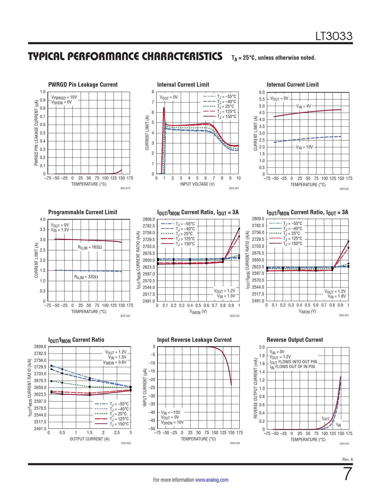 4.0 2809.0 2809.0 V T T OUT = 0V J = –55°C J = –55°C 2782.5 2782.5 3.5 V T T IN = 1.5V J = –40°C J = –40°C 2756.0 2756.0 T T J = 25°C J = 25°C 3.0 2729.5 TJ = 125°C 2729.5 TJ = 125°C T T R J = 150°C J = 150°C TIO (A/A) TIO (A/A) ILIM = 162Ω 2703.0 2703.0 2.5 2676.5 2676.5 2.0 2650.0 2650.0 2623.5 2623.5 1.5 CURRENT RA CURRENT RA 2597.0 2597.0 CURRENT LIMIT (A) RILIM = 332Ω 1.0 /I MON 2570.5 /I MON 2570.5 I OUT 2544.0 I OUT 2544.0 0.5 VOUT = 1.2V VOUT = 1.2V 2517.5 2517.5 VIN = 1.5V VIN = 1.8V 0 2491.0 2491.0 –75 –50 –25 0 25 50 75 100 125 150 175 0 0.1 0.2 0.3 0.4 0.5 0.6 0.7 0.8 0.9 1 0 0.1 0.2 0.3 0.4 0.5 0.6 0.7 0.8 0.9 1 TEMPERATURE (°C) V V IMON (V) IMON (V) 3033 G22 3033 G23 3033 G24