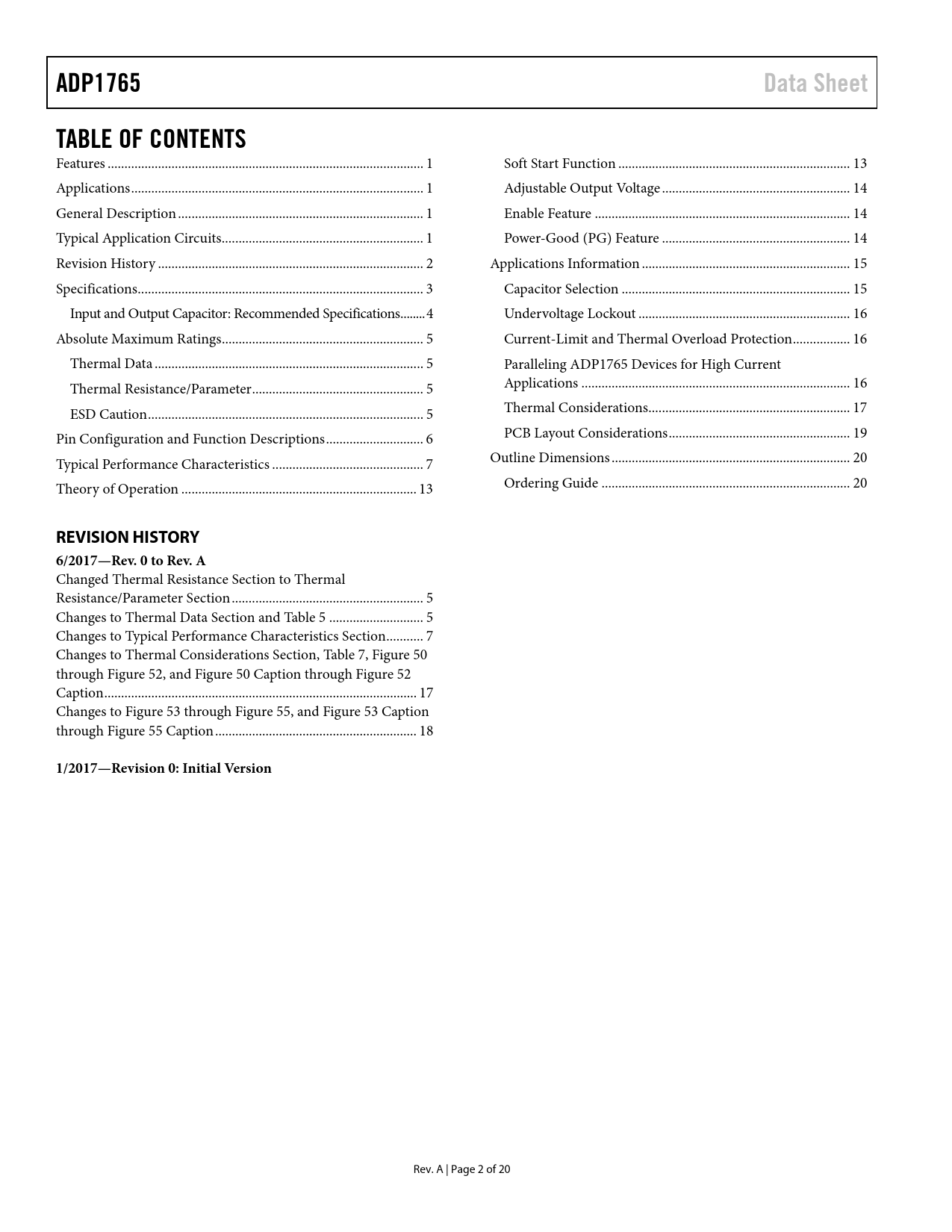 Páginas / Página20 / 2 — ADP1765. Data Sheet. TABLE OF CONTENTS. REVISION HISTORY 6/2017—Rev. 0 to …