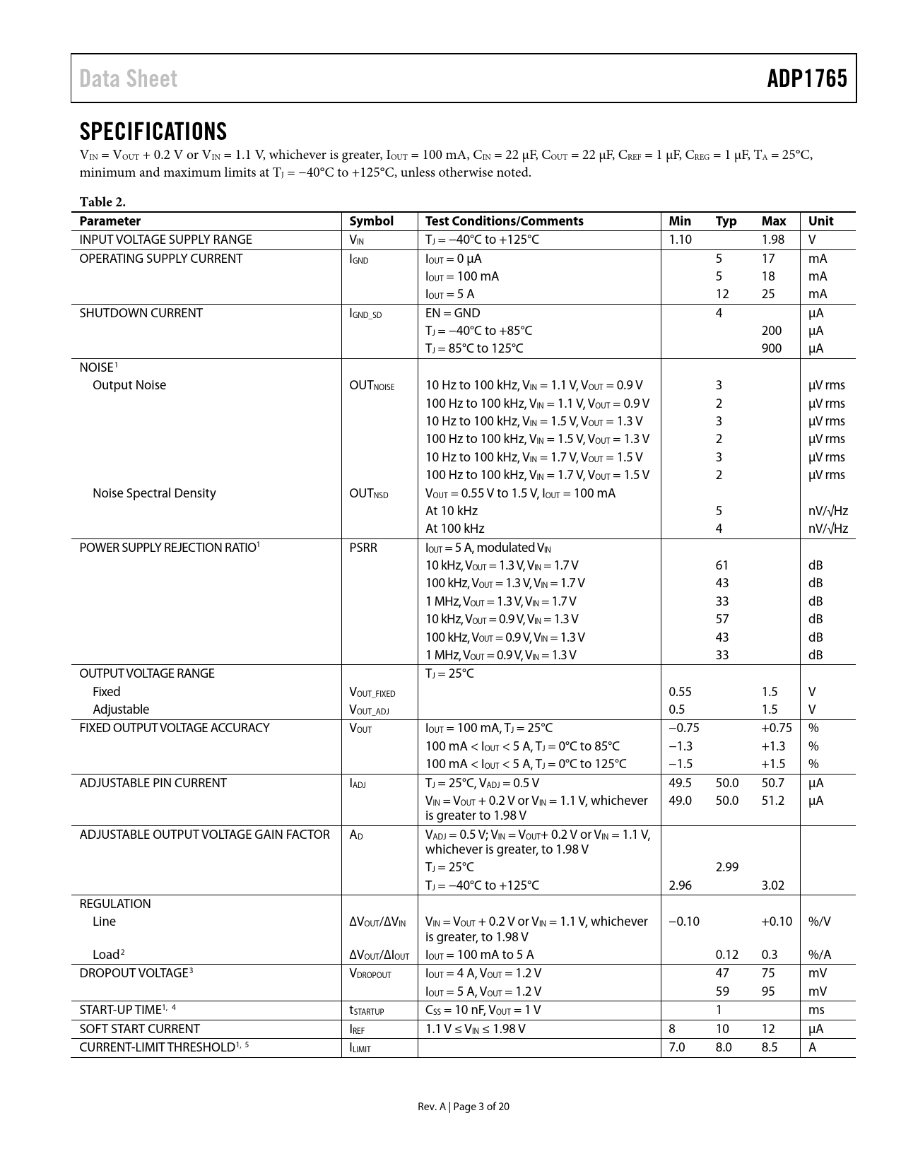 link to page 4 link to page 4 link to page 4 link to page 4 link to page 4 link to page 4 link to page 4 link to page 4 Data SheetADP1765SPECIFICATIONS VIN = VOUT + 0.2 V or VIN = 1.1 V, whichever is greater, IOUT = 100 mA, CIN = 22 µF, COUT = 22 µF, CREF = 1 µF, CREG = 1 µF, TA = 25°C, minimum and maximum limits at TJ = −40°C to +125°C, unless otherwise noted. Table 2. ParameterSymbolTest Conditions/CommentsMinTypMaxUnit INPUT VOLTAGE SUPPLY RANGE VIN TJ = −40°C to +125°C 1.10 1.98 V OPERATING SUPPLY CURRENT IGND IOUT = 0 µA 5 17 mA IOUT = 100 mA 5 18 mA IOUT = 5 A 12 25 mA SHUTDOWN CURRENT IGND_SD EN = GND 4 µA TJ = −40°C to +85°C 200 µA TJ = 85°C to 125°C 900 µA NOISE1 Output Noise OUTNOISE 10 Hz to 100 kHz, VIN = 1.1 V, VOUT = 0.9 V 3 µV rms 100 Hz to 100 kHz, VIN = 1.1 V, VOUT = 0.9 V 2 µV rms 10 Hz to 100 kHz, VIN = 1.5 V, VOUT = 1.3 V 3 µV rms 100 Hz to 100 kHz, VIN = 1.5 V, VOUT = 1.3 V 2 µV rms 10 Hz to 100 kHz, VIN = 1.7 V, VOUT = 1.5 V 3 µV rms 100 Hz to 100 kHz, VIN = 1.7 V, VOUT = 1.5 V 2 µV rms Noise Spectral Density OUTNSD VOUT = 0.55 V to 1.5 V, IOUT = 100 mA At 10 kHz 5 nV/√Hz At 100 kHz 4 nV/√Hz POWER SUPPLY REJECTION RATIO1 PSRR IOUT = 5 A, modulated VIN 10 kHz, VOUT = 1.3 V, VIN = 1.7 V 61 dB 100 kHz, VOUT = 1.3 V, VIN = 1.7 V 43 dB 1 MHz, VOUT = 1.3 V, VIN = 1.7 V 33 dB 10 kHz, VOUT = 0.9 V, VIN = 1.3 V 57 dB 100 kHz, VOUT = 0.9 V, VIN = 1.3 V 43 dB 1 MHz, VOUT = 0.9 V, VIN = 1.3 V 33 dB OUTPUT VOLTAGE RANGE TJ = 25°C Fixed VOUT_FIXED 0.55 1.5 V Adjustable VOUT_ADJ 0.5 1.5 V FIXED OUTPUT VOLTAGE ACCURACY VOUT IOUT = 100 mA, TJ = 25°C −0.75 +0.75 % 100 mA < IOUT < 5 A, TJ = 0°C to 85°C −1.3 +1.3 % 100 mA < IOUT < 5 A, TJ = 0°C to 125°C −1.5 +1.5 % ADJUSTABLE PIN CURRENT IADJ TJ = 25°C, VADJ = 0.5 V 49.5 50.0 50.7 µA VIN = VOUT + 0.2 V or VIN = 1.1 V, whichever 49.0 50.0 51.2 µA is greater to 1.98 V ADJUSTABLE OUTPUT VOLTAGE GAIN FACTOR AD VADJ = 0.5 V; VIN = VOUT+ 0.2 V or VIN = 1.1 V, whichever is greater, to 1.98 V TJ = 25°C 2.99 TJ = −40°C to +125°C 2.96 3.02 REGULATION Line ∆VOUT/∆VIN VIN = VOUT + 0.2 V or VIN = 1.1 V, whichever −0.10 +0.10 %/V is greater, to 1.98 V Load2 ∆VOUT/∆IOUT IOUT = 100 mA to 5 A 0.12 0.3 %/A DROPOUT VOLTAGE3 VDROPOUT IOUT = 4 A, VOUT = 1.2 V 47 75 mV IOUT = 5 A, VOUT = 1.2 V 59 95 mV START-UP TIME1, 4 tSTARTUP CSS = 10 nF, VOUT = 1 V 1 ms SOFT START CURRENT IREF 1.1 V ≤ VIN ≤ 1.98 V 8 10 12 µA CURRENT-LIMIT THRESHOLD1, 5 ILIMIT 7.0 8.0 8.5 A Rev. A | Page 3 of 20 Document Outline FEATURES APPLICATIONS GENERAL DESCRIPTION TYPICAL APPLICATION CIRCUITS REVISION HISTORY SPECIFICATIONS INPUT AND OUTPUT CAPACITOR: RECOMMENDED SPECIFICATIONS ABSOLUTE MAXIMUM RATINGS THERMAL DATA THERMAL RESISTANCE/PARAMETER ESD CAUTION PIN CONFIGURATION AND FUNCTION DESCRIPTIONS TYPICAL PERFORMANCE CHARACTERISTICS THEORY OF OPERATION SOFT START FUNCTION ADJUSTABLE OUTPUT VOLTAGE ENABLE FEATURE POWER-GOOD (PG) FEATURE APPLICATIONS INFORMATION CAPACITOR SELECTION Output Capacitor Input Bypass Capacitor Input and Output Capacitor Properties UNDERVOLTAGE LOCKOUT CURRENT-LIMIT AND THERMAL OVERLOAD PROTECTION PARALLELING ADP1765 DEVICES FOR HIGH CURRENT APPLICATIONS THERMAL CONSIDERATIONS PCB LAYOUT CONSIDERATIONS OUTLINE DIMENSIONS ORDERING GUIDE