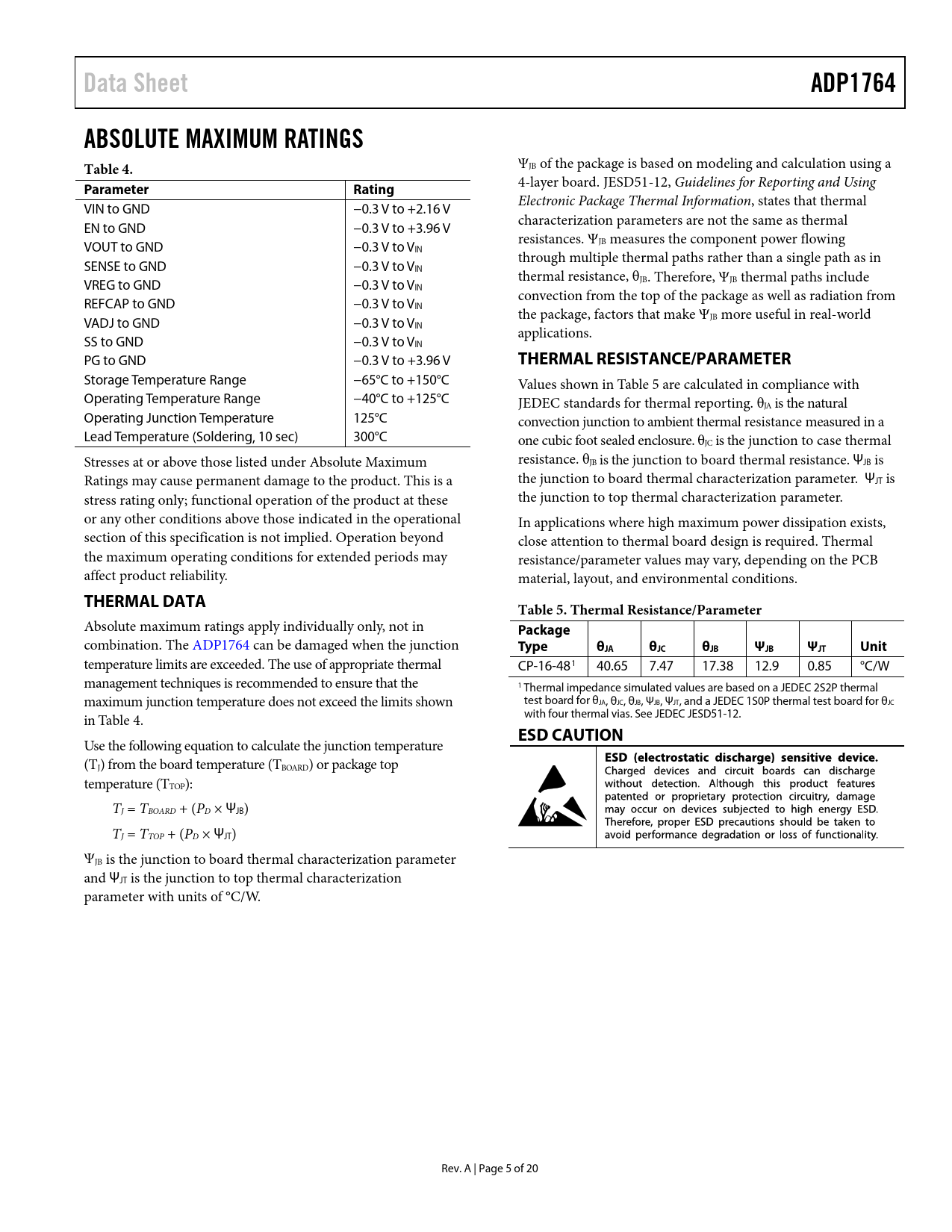 link to page 5 link to page 5 Data SheetADP1764ABSOLUTE MAXIMUM RATINGS Table 4. ΨJB of the package is based on modeling and calculation using a ParameterRating 4-layer board. JESD51-12, Guidelines for Reporting and Using Electronic Package Thermal Information, states that thermal VIN to GND −0.3 V to +2.16 V characterization parameters are not the same as thermal EN to GND −0.3 V to +3.96 V resistances. Ψ VOUT to GND −0.3 V to V JB measures the component power flowing IN through multiple thermal paths rather than a single path as in SENSE to GND −0.3 V to VIN thermal resistance, θ VREG to GND −0.3 V to V JB. Therefore, ΨJB thermal paths include IN convection from the top of the package as wel as radiation from REFCAP to GND −0.3 V to VIN the package, factors that make Ψ VADJ to GND −0.3 V to V JB more useful in real-world IN applications. SS to GND −0.3 V to VIN PG to GND −0.3 V to +3.96 V THERMAL RESISTANCE/PARAMETER Storage Temperature Range −65°C to +150°C Values shown in Table 5 are calculated in compliance with Operating Temperature Range −40°C to +125°C JEDEC standards for thermal reporting. θJA is the natural Operating Junction Temperature 125°C convection junction to ambient thermal resistance measured in a Lead Temperature (Soldering, 10 sec) 300°C one cubic foot sealed enclosure. θJC is the junction to case thermal Stresses at or above those listed under Absolute Maximum resistance. θJB is the junction to board thermal resistance. ΨJB is Ratings may cause permanent damage to the product. This is a the junction to board thermal characterization parameter. ΨJT is stress rating only; functional operation of the product at these the junction to top thermal characterization parameter. or any other conditions above those indicated in the operational In applications where high maximum power dissipation exists, section of this specification is not implied. Operation beyond close attention to thermal board design is required. Thermal the maximum operating conditions for extended periods may resistance/parameter values may vary, depending on the PCB affect product reliability. material, layout, and environmental conditions. THERMAL DATATable 5. Thermal Resistance/Parameter Absolute maximum ratings apply individually only, not in Package combination. The ADP1764 can be damaged when the junction TypeθJAθJCθJBΨJBΨJTUnit temperature limits are exceeded. The use of appropriate thermal CP-16-481 40.65 7.47 17.38 12.9 0.85 °C/W management techniques is recommended to ensure that the 1 Thermal impedance simulated values are based on a JEDEC 2S2P thermal maximum junction temperature does not exceed the limits shown test board for θJA, θJC, θJB, ΨJB, ΨJT, and a JEDEC 1S0P thermal test board for θJC in Table 4. with four thermal vias. See JEDEC JESD51-12. ESD CAUTION Use the fol owing equation to calculate the junction temperature (TJ) from the board temperature (TBOARD) or package top temperature (TTOP): TJ = TBOARD + (PD × ΨJB) TJ = TTOP + (PD × ΨJT) ΨJB is the junction to board thermal characterization parameter and ΨJT is the junction to top thermal characterization parameter with units of °C/W. Rev. A | Page 5 of 20 Document Outline FEATURES APPLICATIONS GENERAL DESCRIPTION TYPICAL APPLICATION CIRCUITS REVISION HISTORY SPECIFICATIONS INPUT AND OUTPUT CAPACITOR: RECOMMENDED SPECIFICATIONS ABSOLUTE MAXIMUM RATINGS THERMAL DATA THERMAL RESISTANCE/PARAMETER ESD CAUTION PIN CONFIGURATION AND FUNCTION DESCRIPTIONS TYPICAL PERFORMANCE CHARACTERISTICS THEORY OF OPERATION SOFT START FUNCTION ADJUSTABLE OUTPUT VOLTAGE ENABLE FEATURE POWER-GOOD (PG) FEATURE APPLICATIONS INFORMATION CAPACITOR SELECTION Output Capacitor Input Bypass Capacitor Input and Output Capacitor Properties UNDERVOLTAGE LOCKOUT CURRENT-LIMIT AND THERMAL OVERLOAD PROTECTION PARALLELING ADP1764 DEVICES FOR HIGH CURRENT APPLICATIONS THERMAL CONSIDERATIONS PCB LAYOUT CONSIDERATIONS OUTLINE DIMENSIONS ORDERING GUIDE