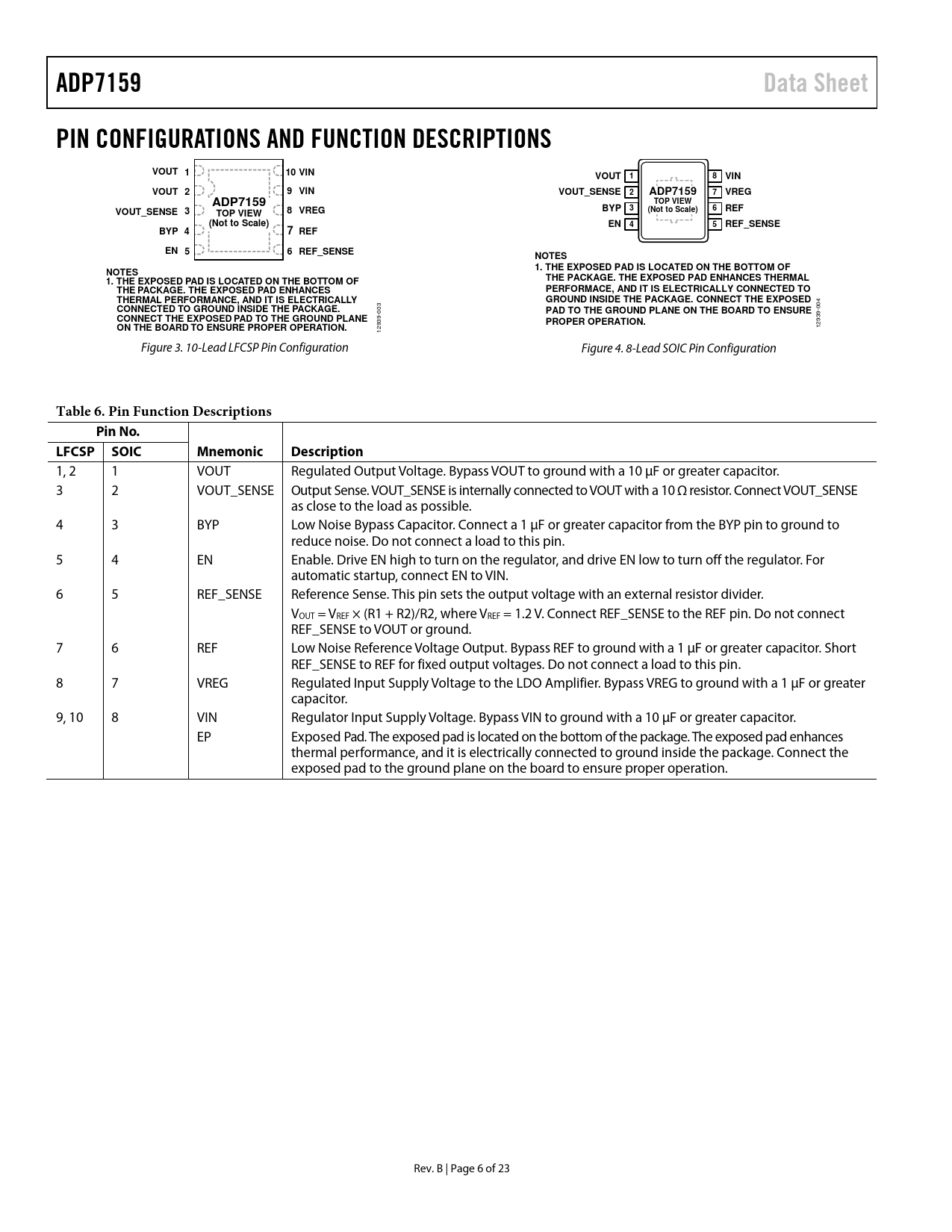Páginas / Página23 / 6 — ADP7159. Data Sheet. PIN CONFIGURATIONS AND FUNCTION DESCRIPTIONS. VOUT …