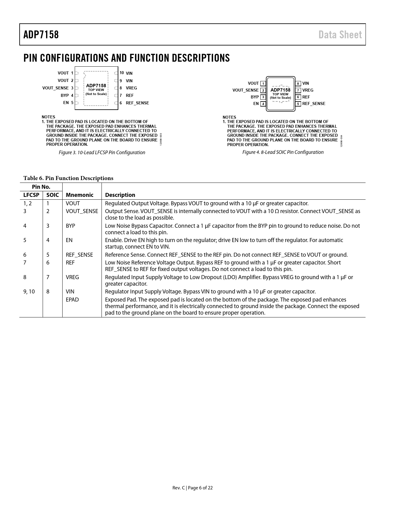 Páginas / Página22 / 6 — ADP7158. Data Sheet. PIN CONFIGURATIONS AND FUNCTION DESCRIPTIONS. VOUT …