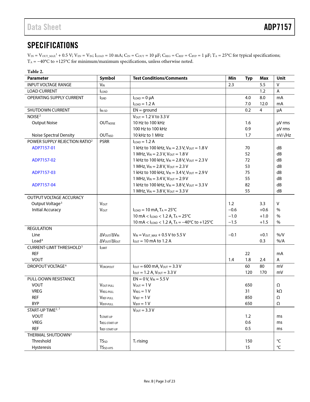 link to page 4 link to page 4 link to page 4 link to page 4 link to page 4 link to page 4 link to page 4 link to page 4 link to page 4 Data SheetADP7157SPECIFICATIONS V 1 IN = VOUT_MAX + 0.5 V; VEN = VIN; ILOAD = 10 mA; CIN = COUT = 10 µF; CREG = CREF = CBYP = 1 µF; TA = 25°C for typical specifications; TA = −40°C to +125°C for minimum/maximum specifications, unless otherwise noted. Table 2. ParameterSymbolTest Conditions/CommentsMinTypMaxUnit INPUT VOLTAGE RANGE VIN 2.3 5.5 V LOAD CURRENT ILOAD 1.2 A OPERATING SUPPLY CURRENT IGND ILOAD = 0 µA 4.0 8.0 mA ILOAD = 1.2 A 7.0 12.0 mA SHUTDOWN CURRENT IIN-SD EN = ground 0.2 4 µA NOISE2 VOUT = 1.2 V to 3.3 V Output Noise OUTNOISE 10 Hz to 100 kHz 1.6 µV rms 100 Hz to 100 kHz 0.9 µV rms Noise Spectral Density OUTNSD 10 kHz to 1 MHz 1.7 nV/√Hz POWER SUPPLY REJECTION RATIO2 PSRR ILOAD = 1.2 A ADP7157-01 1 kHz to 100 kHz, VIN = 2.3 V, VOUT = 1.8 V 70 dB 1 MHz, VIN = 2.3 V, VOUT = 1.8 V 52 dB ADP7157-02 1 kHz to 100 kHz, VIN = 2.8 V, VOUT = 2.3 V 72 dB 1 MHz, VIN = 2.8 V, VOUT = 2.3 V 53 dB ADP7157-03 1 kHz to 100 kHz, VIN = 3.4 V, VOUT = 2.9 V 75 dB 1 MHz, VIN = 3.4 V, VOUT = 2.9 V 55 dB ADP7157-04 1 kHz to 100 kHz, VIN = 3.8 V, VOUT = 3.3 V 82 dB 1 MHz, VIN = 3.8 V, VOUT = 3.3 V 55 dB OUTPUT VOLTAGE ACCURACY Output Voltage3 VOUT 1.2 3.3 V Initial Accuracy VOUT ILOAD = 10 mA, TA = 25°C −0.6 +0.6 % 10 mA < ILOAD < 1.2 A, TA = 25°C −1.0 +1.0 % 10 mA < ILOAD < 1.2 A, TA = −40°C to +125°C −1.5 +1.5 % REGULATION Line ∆VOUT/∆VIN VIN = VOUT_MAX + 0.5 V to 5.5 V −0.1 +0.1 %/V Load4 ∆VOUT/∆IOUT IOUT = 10 mA to 1.2 A 0.3 %/A CURRENT-LIMIT THRESHOLD5 ILIMIT REF 22 mA VOUT 1.4 1.8 2.4 A DROPOUT VOLTAGE6 VDROPOUT IOUT = 600 mA, VOUT = 3.3 V 60 80 mV IOUT = 1.2 A, VOUT = 3.3 V 120 170 mV PULL-DOWN RESISTANCE EN = 0 V, VIN = 5.5 V VOUT VOUT-PULL VOUT = 1 V 650 Ω VREG VREG-PULL VREG = 1 V 31 kΩ REF VREF-PULL VREF = 1 V 850 Ω BYP VBYP-PULL VBYP = 1 V 650 Ω START-UP TIME2, 7 VOUT = 3.3 V VOUT tSTART-UP 1.2 ms VREG tREG-START-UP 0.6 ms REF tREF-START-UP 0.5 ms THERMAL SHUTDOWN2 Threshold TSSD TJ rising 150 °C Hysteresis TSSD-HYS 15 °C Rev. B | Page 3 of 23 Document Outline FEATURES APPLICATIONS GENERAL DESCRIPTION TYPICAL APPLICATION CIRCUIT REVISION HISTORY SPECIFICATIONS ABSOLUTE MAXIMUM RATINGS THERMAL DATA THERMAL RESISTANCE ESD CAUTION PIN CONFIGURATIONS AND FUNCTION DESCRIPTIONS TYPICAL PERFORMANCE CHARACTERISTICS THEORY OF OPERATION APPLICATIONS INFORMATION ADIsimPOWER DESIGN TOOL CAPACITOR SELECTION Output Capacitor Input and VREG Capacitor REF Capacitor BYP Capacitor Capacitor Properties UNDERVOLTAGE LOCKOUT (UVLO) PROGRAMMABLE PRECISION ENABLE START-UP TIME REF, BYP, AND VREG PINS CURRENT-LIMIT AND THERMAL SHUTDOWN THERMAL CONSIDERATIONS Thermal Characterization Parameter (ΨJB) PSRR PERFORMANCE PCB LAYOUT CONSIDERATIONS OUTLINE DIMENSIONS ORDERING GUIDE