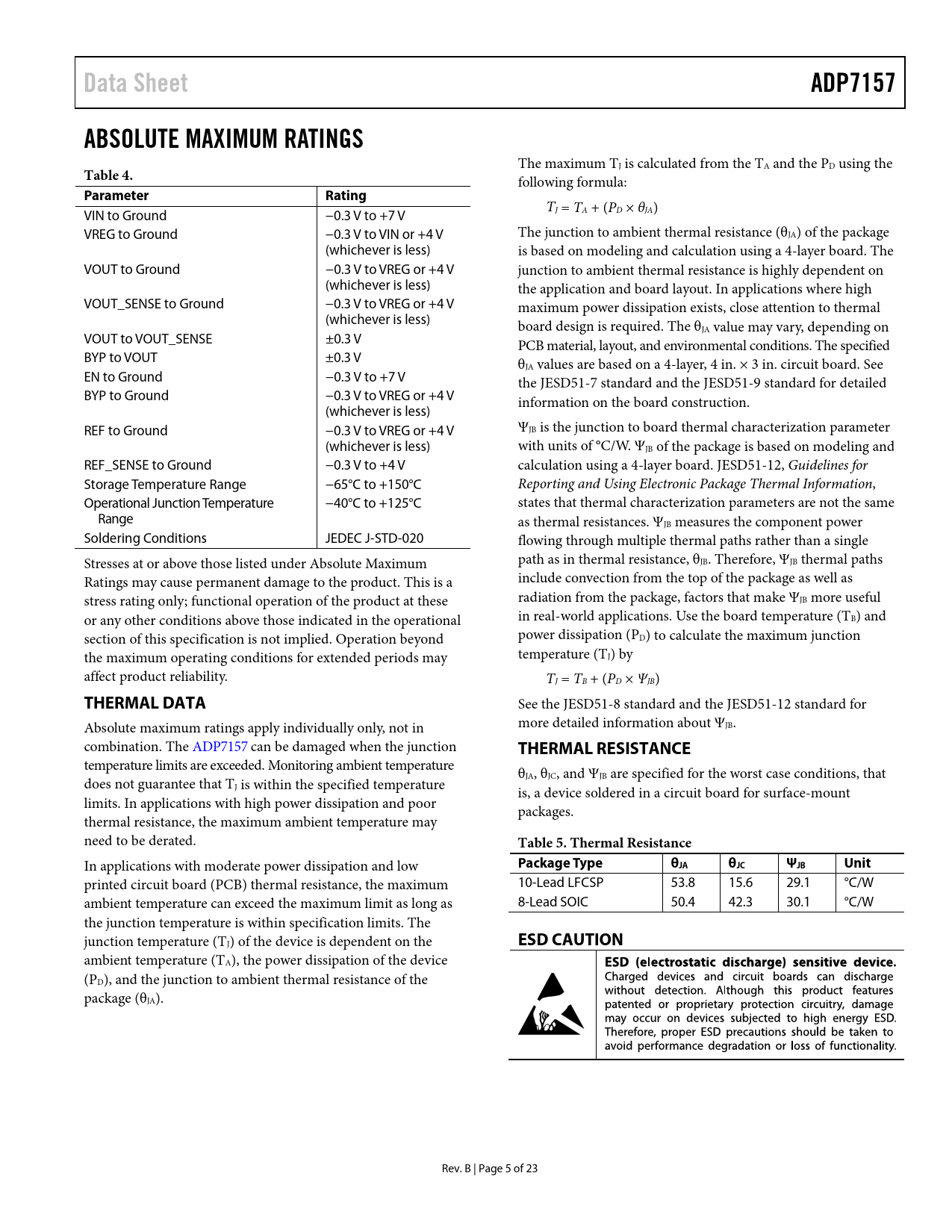 Data Sheet ADP7157 ABSOLUTE MAXIMUM RATINGS Table 4 Parameter Rating THERMAL DATA THERMAL RESISTANCE