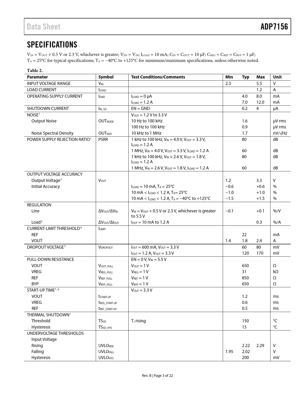Data Sheet. ADP7156. SPECIFICATIONS. Table 2. Parameter. Symbol. Test Conditions/Comments. Min. Typ. Max. Unit