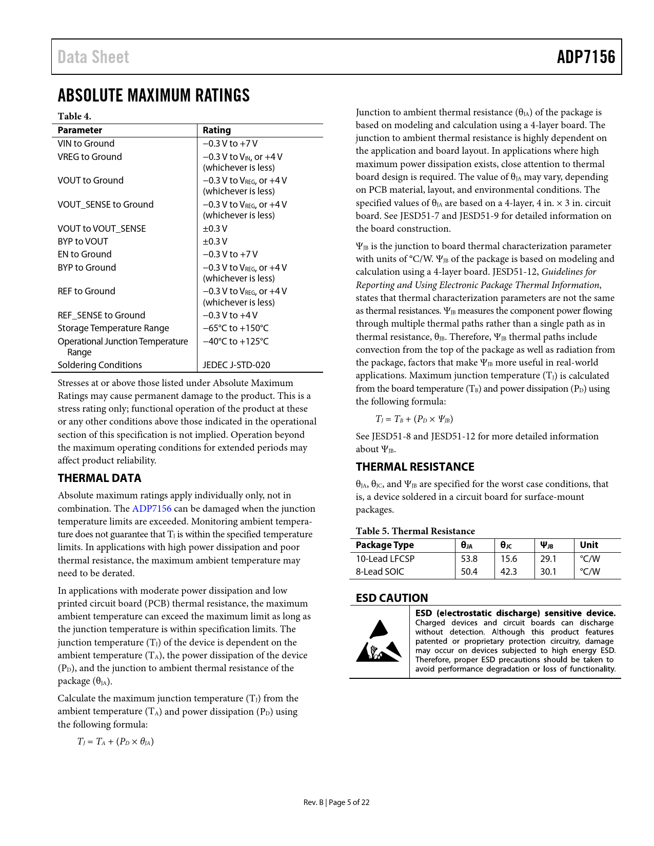 Data SheetADP7156ABSOLUTE MAXIMUM RATINGS Table 4. Junction to ambient thermal resistance (θJA) of the package is ParameterRating based on modeling and calculation using a 4-layer board. The junction to ambient thermal resistance is highly dependent on VIN to Ground −0.3 V to +7 V the application and board layout. In applications where high VREG to Ground −0.3 V to VIN, or +4 V (whichever is less) maximum power dissipation exists, close attention to thermal VOUT to Ground −0.3 V to V board design is required. The value of θJA may vary, depending REG, or +4 V (whichever is less) on PCB material, layout, and environmental conditions. The VOUT_SENSE to Ground −0.3 V to VREG, or +4 V specified values of θJA are based on a 4-layer, 4 in. × 3 in. circuit (whichever is less) board. See JESD51-7 and JESD51-9 for detailed information on VOUT to VOUT_SENSE ±0.3 V the board construction. BYP to VOUT ±0.3 V ΨJB is the junction to board thermal characterization parameter EN to Ground −0.3 V to +7 V with units of °C/W. ΨJB of the package is based on modeling and BYP to Ground −0.3 V to VREG, or +4 V calculation using a 4-layer board. JESD51-12, Guidelines for (whichever is less) Reporting and Using Electronic Package Thermal Information, REF to Ground −0.3 V to VREG, or +4 V (whichever is less) states that thermal characterization parameters are not the same REF_SENSE to Ground −0.3 V to +4 V as thermal resistances. ΨJB measures the component power flowing Storage Temperature Range −65°C to +150°C through multiple thermal paths rather than a single path as in Operational Junction Temperature −40°C to +125°C thermal resistance, θJB. Therefore, ΨJB thermal paths include Range convection from the top of the package as wel as radiation from Soldering Conditions JEDEC J-STD-020 the package, factors that make ΨJB more useful in real-world applications. Maximum junction temperature (T Stresses at or above those listed under Absolute Maximum J) is calculated from the board temperature (T Ratings may cause permanent damage to the product. This is a B) and power dissipation (PD) using the following formula: stress rating only; functional operation of the product at these or any other conditions above those indicated in the operational TJ = TB + (PD × ΨJB) section of this specification is not implied. Operation beyond See JESD51-8 and JESD51-12 for more detailed information the maximum operating conditions for extended periods may about ΨJB. affect product reliability. THERMAL RESISTANCETHERMAL DATA θJA, θJC, and ΨJB are specified for the worst case conditions, that Absolute maximum ratings apply individually only, not in is, a device soldered in a circuit board for surface-mount combination. The ADP7156 can be damaged when the junction packages. temperature limits are exceeded. Monitoring ambient tempera- ture does not guarantee that T Table 5. Thermal Resistance J is within the specified temperature limits. In applications with high power dissipation and poor Package TypeθJAθJCΨJBUnit thermal resistance, the maximum ambient temperature may 10-Lead LFCSP 53.8 15.6 29.1 °C/W need to be derated. 8-Lead SOIC 50.4 42.3 30.1 °C/W In applications with moderate power dissipation and low printed circuit board (PCB) thermal resistance, the maximum ESD CAUTION ambient temperature can exceed the maximum limit as long as the junction temperature is within specification limits. The junction temperature (TJ) of the device is dependent on the ambient temperature (TA), the power dissipation of the device (PD), and the junction to ambient thermal resistance of the package (θJA). Calculate the maximum junction temperature (TJ) from the ambient temperature (T A) and power dissipation (PD) using the following formula: TJ = TA + (PD × θJA) Rev. B | Page 5 of 22 Document Outline FEATURES APPLICATIONS GENERAL DESCRIPTION TYPICAL APPLICATION CIRCUIT REVISION HISTORY SPECIFICATIONS INPUT AND OUTPUT CAPACITORS, RECOMMENDED SPECIFICATIONS ABSOLUTE MAXIMUM RATINGS THERMAL DATA THERMAL RESISTANCE ESD CAUTION PIN CONFIGURATIONS AND FUNCTION DESCRIPTIONS TYPICAL PERFORMANCE CHARACTERISTICS THEORY OF OPERATION APPLICATIONS INFORMATION ADIsimPOWER DESIGN TOOL CAPACITOR SELECTION Output Capacitor Input and VREG Capacitor REF Capacitor BYP Capacitor Capacitor Properties UNDERVOLTAGE LOCKOUT (UVLO) PROGRAMMABLE PRECISION ENABLE START-UP TIME REF, BYP, AND VREG PINS CURRENT-LIMIT AND THERMAL SHUTDOWN THERMAL CONSIDERATIONS Thermal Characterization Parameter (ΨJB) PRINTED CIRCUIT BOARD (PCB) LAYOUT CONSIDERATIONS OUTLINE DIMENSIONS ORDERING GUIDE