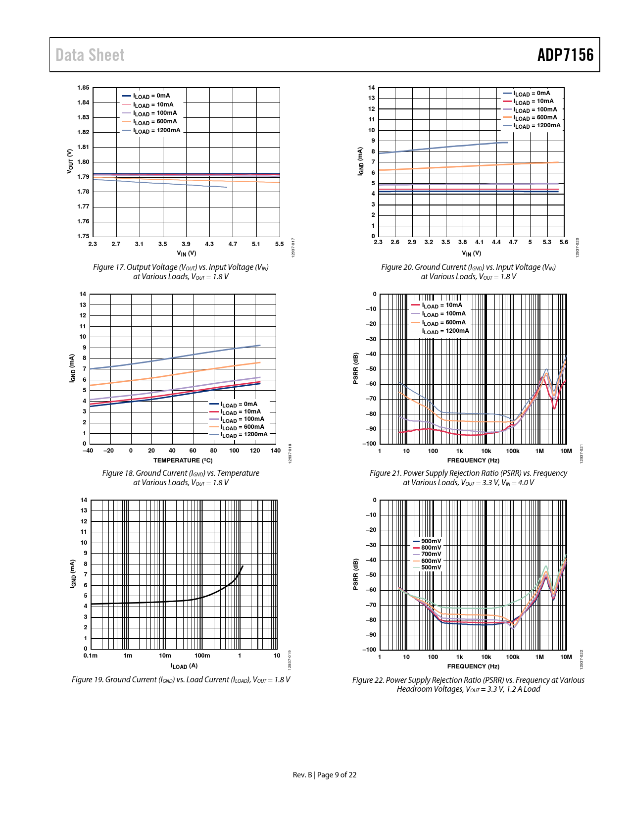 Data SheetADP71561.8514IILOAD = 0mALOAD = 0mA131.84IILOAD = 10mALOAD = 10mA12IILOAD = 100mA1.83LOAD = 100mAII11LOAD = 600mALOAD = 600mAILOAD = 1200mA1.82ILOAD = 1200mA1091.818(V)mA)1.80(UT7ONDV61.79I G51.7841.77321.7611.7502.32.73.13.53.94.34.75.15.5 017 2.32.62.93.23.53.84.14.44.755.35.6 020 VIN (V)V 12937- IN (V) 12937- Figure 17. Output Voltage (VOUT) vs. Input Voltage (VIN) Figure 20. Ground Current (IGND) vs. Input Voltage (VIN) at Various Loads, VOUT = 1.8 V at Various Loads, VOUT = 1.8 V 14013I–10LOAD = 10mA12ILOAD = 100mA I11–20LOAD = 600mAILOAD = 1200mA10–309–408B)mA)d(7–50NDRR (6SI GP–6054–70ILOAD = 0mA3ILOAD = 10mA–80I2LOAD = 100mAILOAD = 600mA–901ILOAD = 1200mA0–100–40–20020406080100120140 018 1101001k10k100k1M10M 021 TEMPERATURE (ºC) 12937- FREQUENCY (Hz) 12937- Figure 18. Ground Current (IGND) vs. Temperature Figure 21. Power Supply Rejection Ratio (PSRR) vs. Frequency at Various Loads, VOUT = 1.8 V at Various Loads, VOUT = 3.3 V, VIN = 4.0 V 14013–101211–2010900mV–30800mV9700mV–408B)600mVmA)d500mV(7–50NDRR (I G6S P–6054–703–802–9010–1000.1m1m10m100m110 019 1101001k10k100k1M10M 022 ILOAD (A)FREQUENCY (Hz) 12937- 12937- Figure 19. Ground Current (IGND) vs. Load Current (ILOAD), VOUT = 1.8 V Figure 22. Power Supply Rejection Ratio (PSRR) vs. Frequency at Various Headroom Voltages, VOUT = 3.3 V, 1.2 A Load Rev. B | Page 9 of 22 Document Outline FEATURES APPLICATIONS GENERAL DESCRIPTION TYPICAL APPLICATION CIRCUIT REVISION HISTORY SPECIFICATIONS INPUT AND OUTPUT CAPACITORS, RECOMMENDED SPECIFICATIONS ABSOLUTE MAXIMUM RATINGS THERMAL DATA THERMAL RESISTANCE ESD CAUTION PIN CONFIGURATIONS AND FUNCTION DESCRIPTIONS TYPICAL PERFORMANCE CHARACTERISTICS THEORY OF OPERATION APPLICATIONS INFORMATION ADIsimPOWER DESIGN TOOL CAPACITOR SELECTION Output Capacitor Input and VREG Capacitor REF Capacitor BYP Capacitor Capacitor Properties UNDERVOLTAGE LOCKOUT (UVLO) PROGRAMMABLE PRECISION ENABLE START-UP TIME REF, BYP, AND VREG PINS CURRENT-LIMIT AND THERMAL SHUTDOWN THERMAL CONSIDERATIONS Thermal Characterization Parameter (ΨJB) PRINTED CIRCUIT BOARD (PCB) LAYOUT CONSIDERATIONS OUTLINE DIMENSIONS ORDERING GUIDE