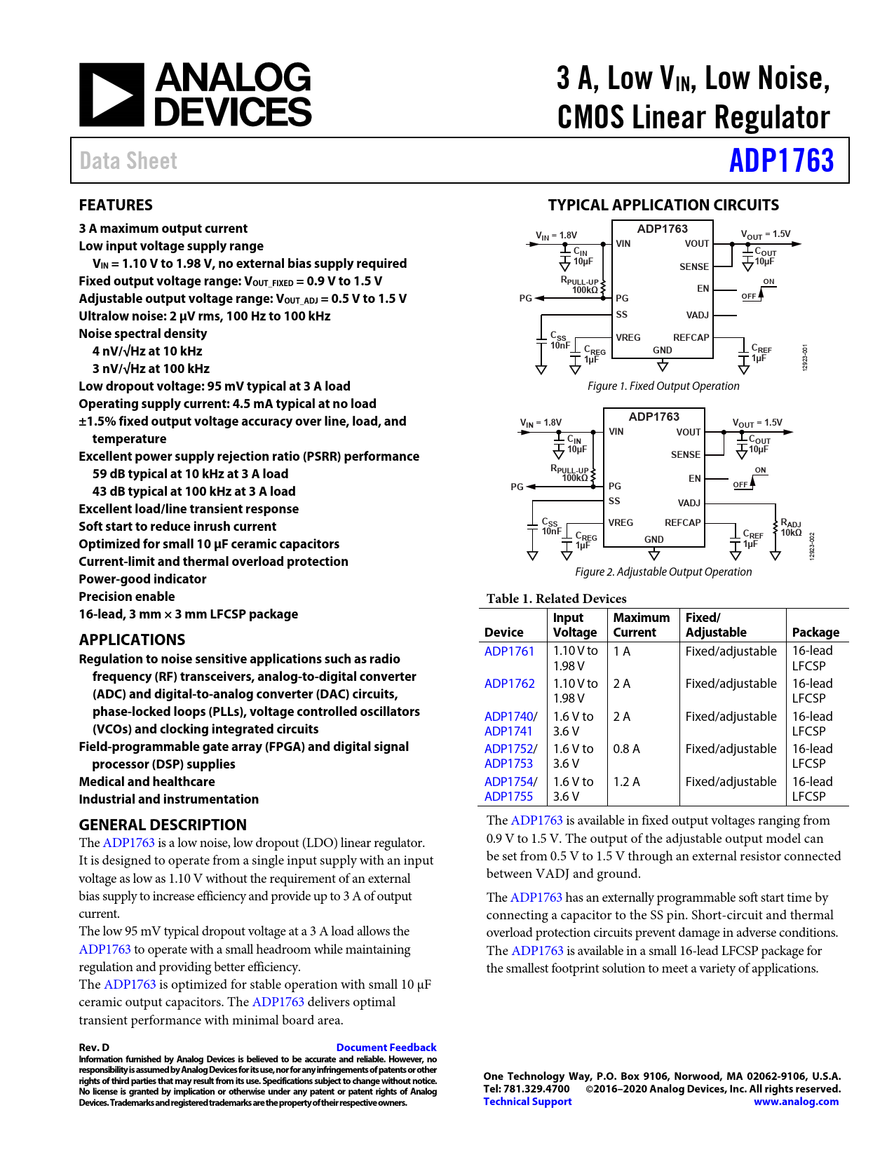 Power-good indicator Precision enable Table 1. Related Devices 16-lead, 3 mm × 3 mm LFCSP package Input Maximum Fixed/ Device Voltage Current Adjustable Package APPLICATIONS