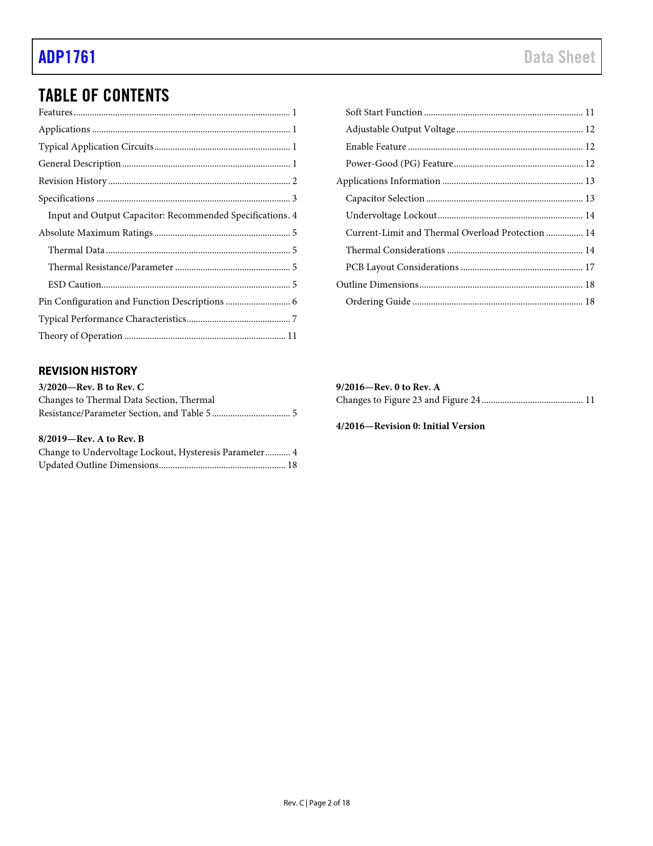 ADP1761 Data Sheet TABLE OF CONTENTS REVISION HISTORY 3/2020—Rev B to Rev C 9/2016—Rev 0 to Rev A