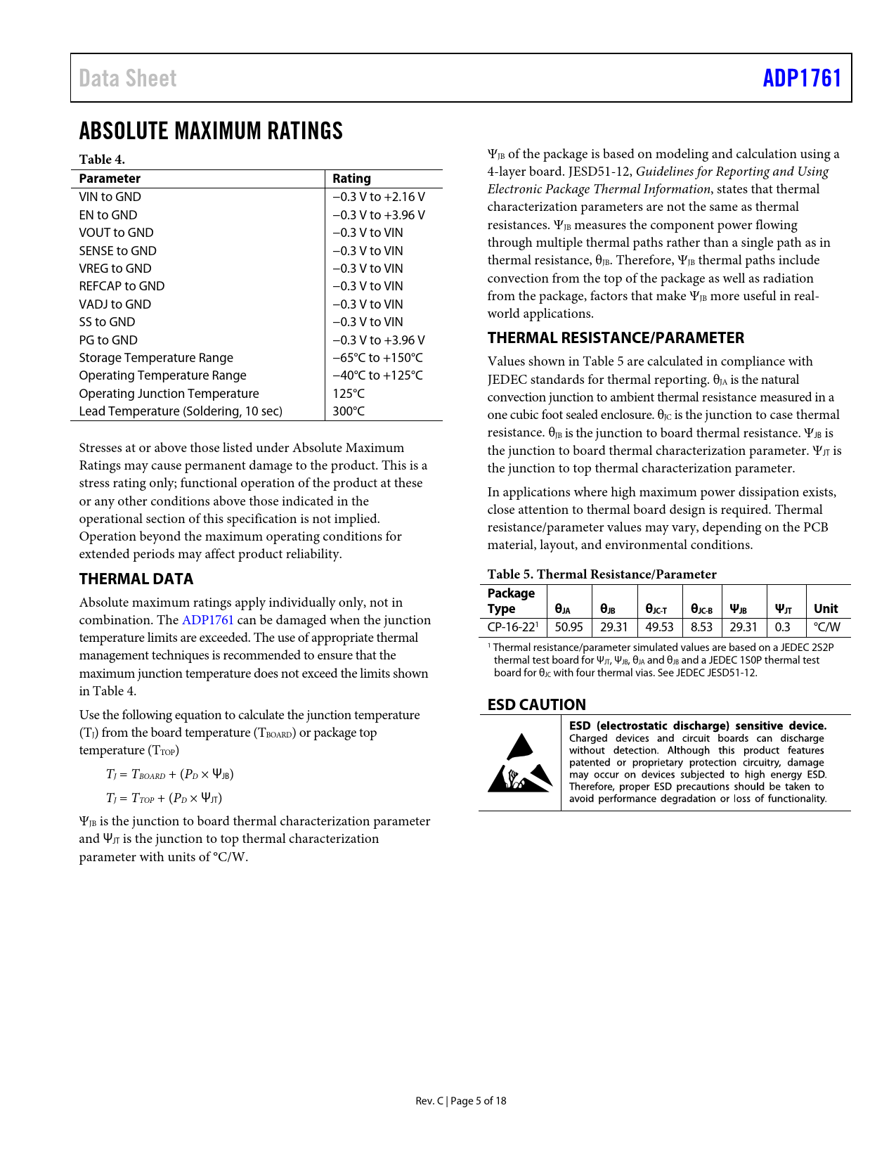Data Sheet ADP1761 ABSOLUTE MAXIMUM RATINGS Table 4 Parameter Rating THERMAL RESISTANCE/PARAMETER THERMAL DATA
