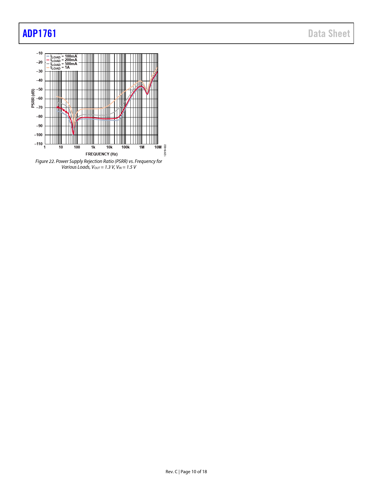 ADP1761. Data Sheet. –10. LOAD = 100mA. –20. LOAD = 200mA. ILOAD = 500mA. ILOAD = 1A. –30. –40. –50. B) (d –60. RR S P –70. –80. –90. –100. –110. 100. 10k