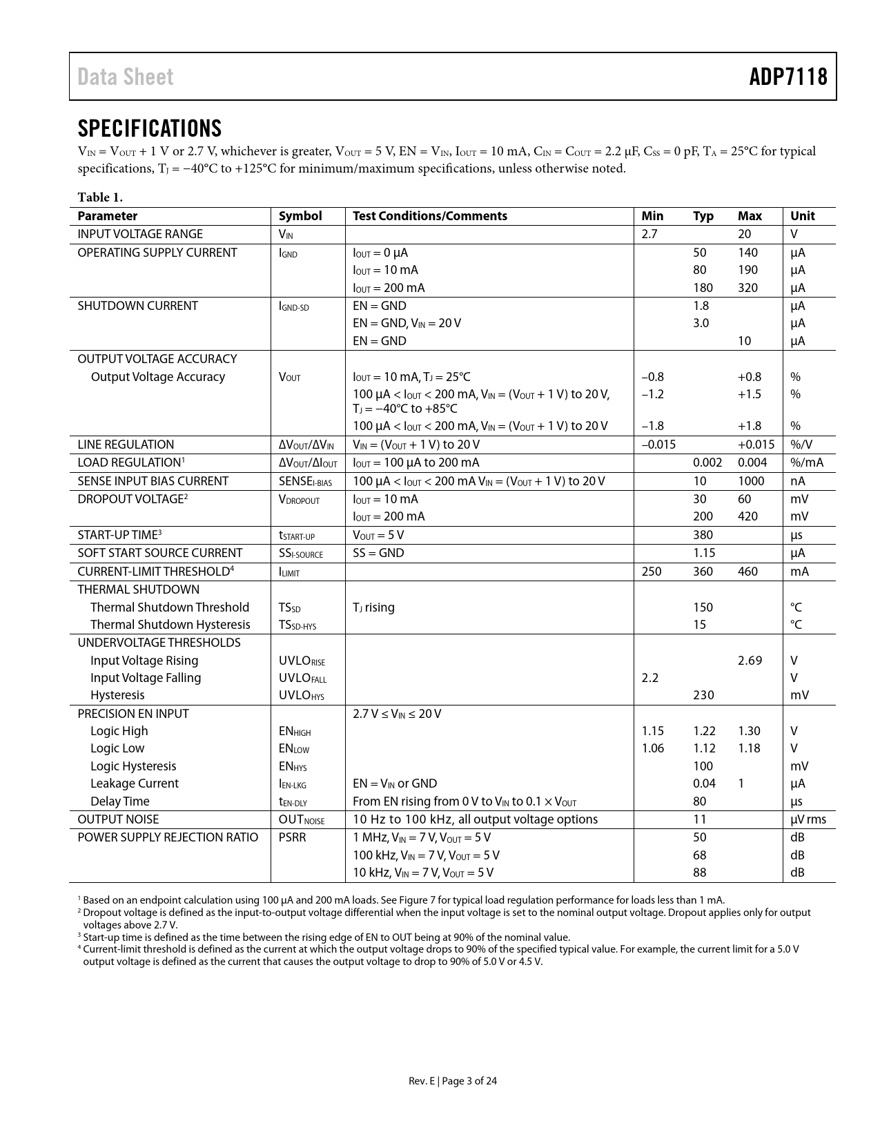 Data Sheet. ADP7118. SPECIFICATIONS. Table 1. Parameter. Symbol. Test Conditions/Comments. Min. Typ. Max. Unit