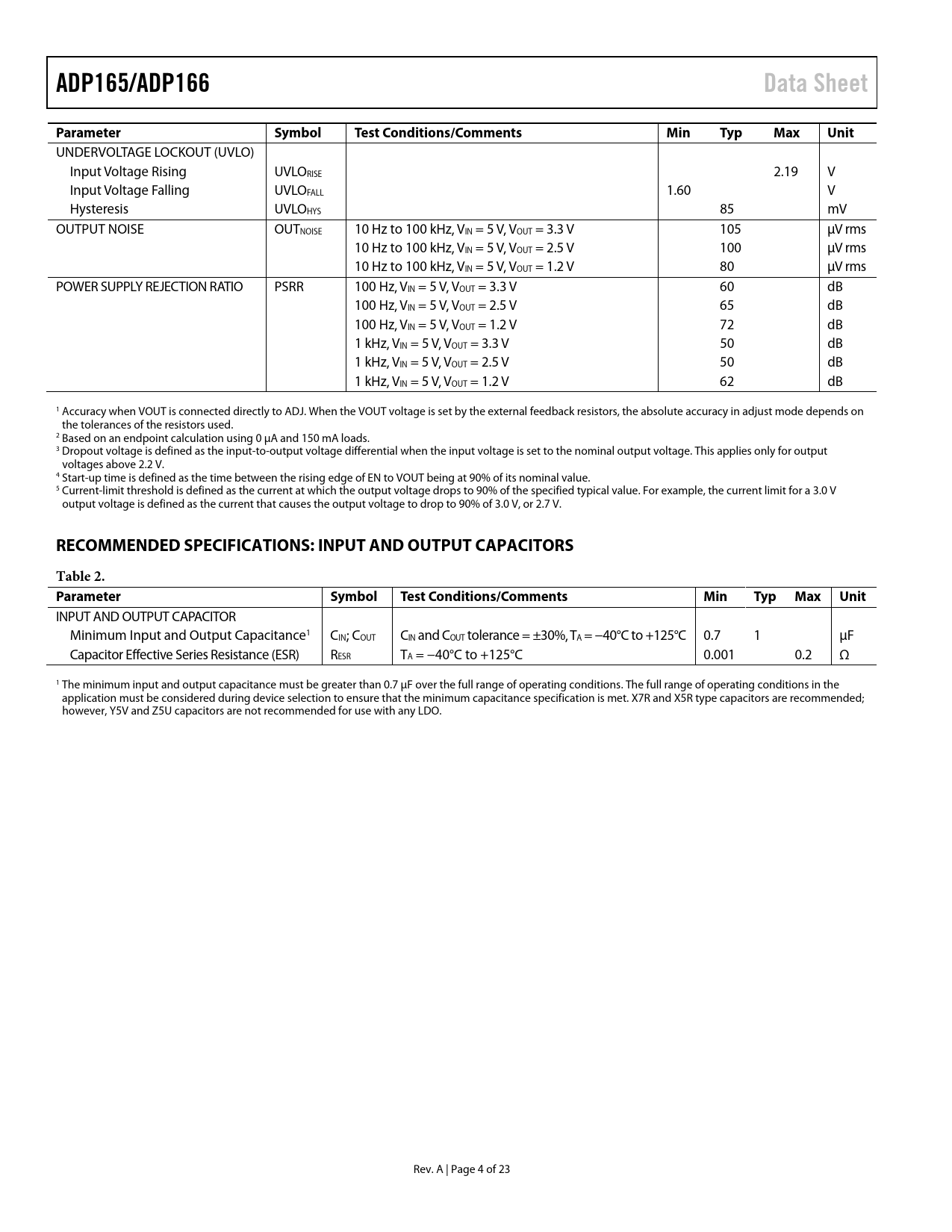 Páginas / Página23 / 4 — ADP165/ADP166. Data Sheet. Parameter. Symbol. Test Conditions/Comments. …