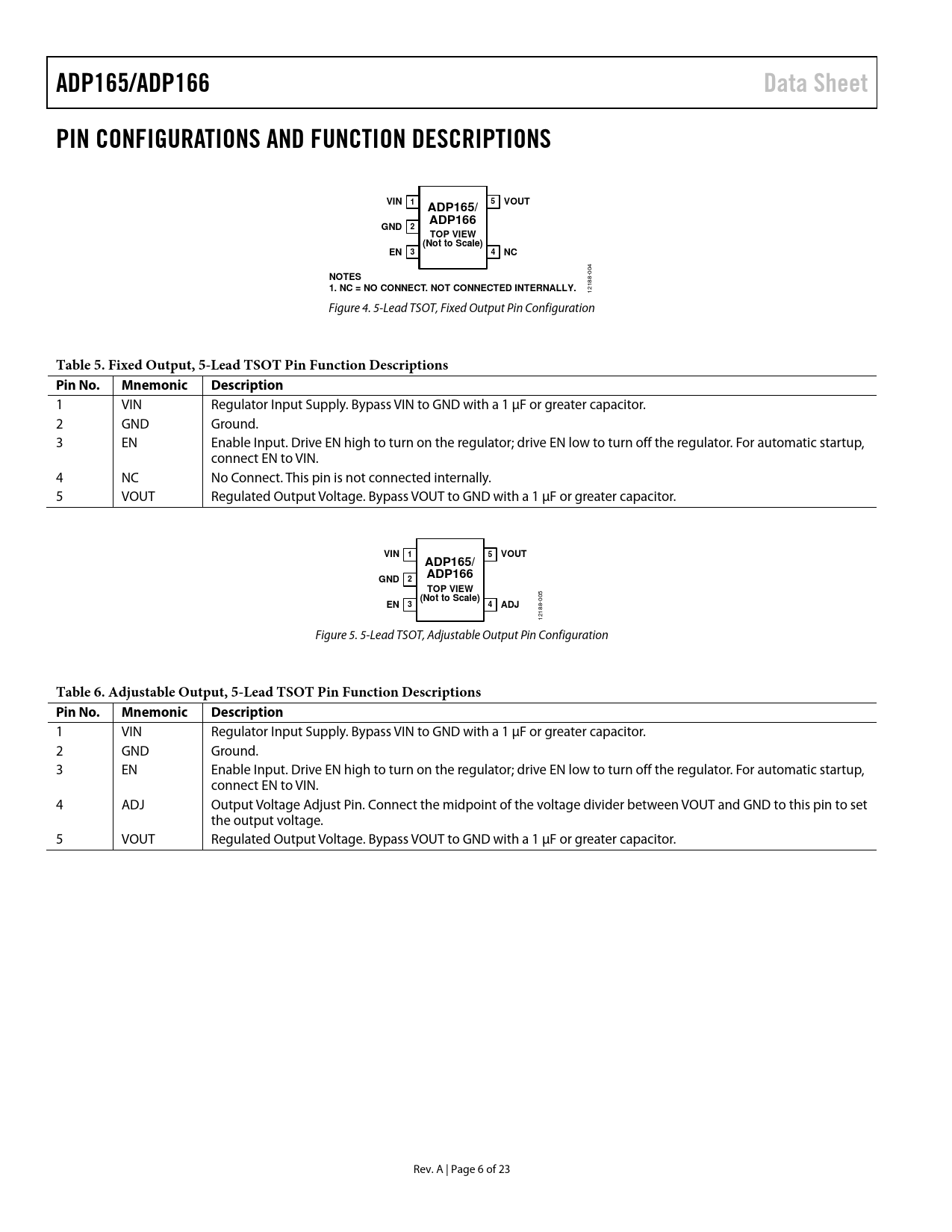 Páginas / Página23 / 6 — ADP165/ADP166. Data Sheet. PIN CONFIGURATIONS AND FUNCTION DESCRIPTIONS. …